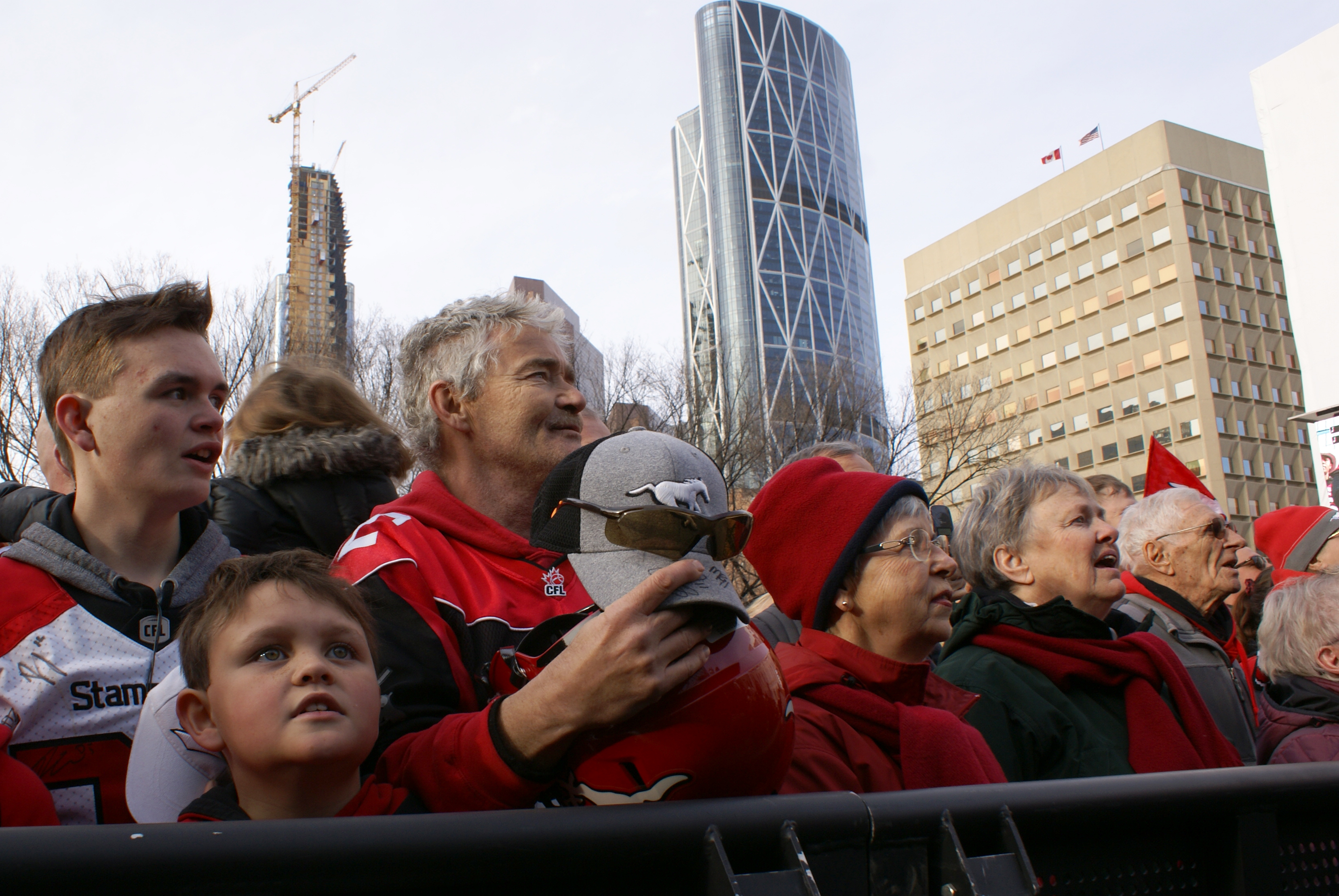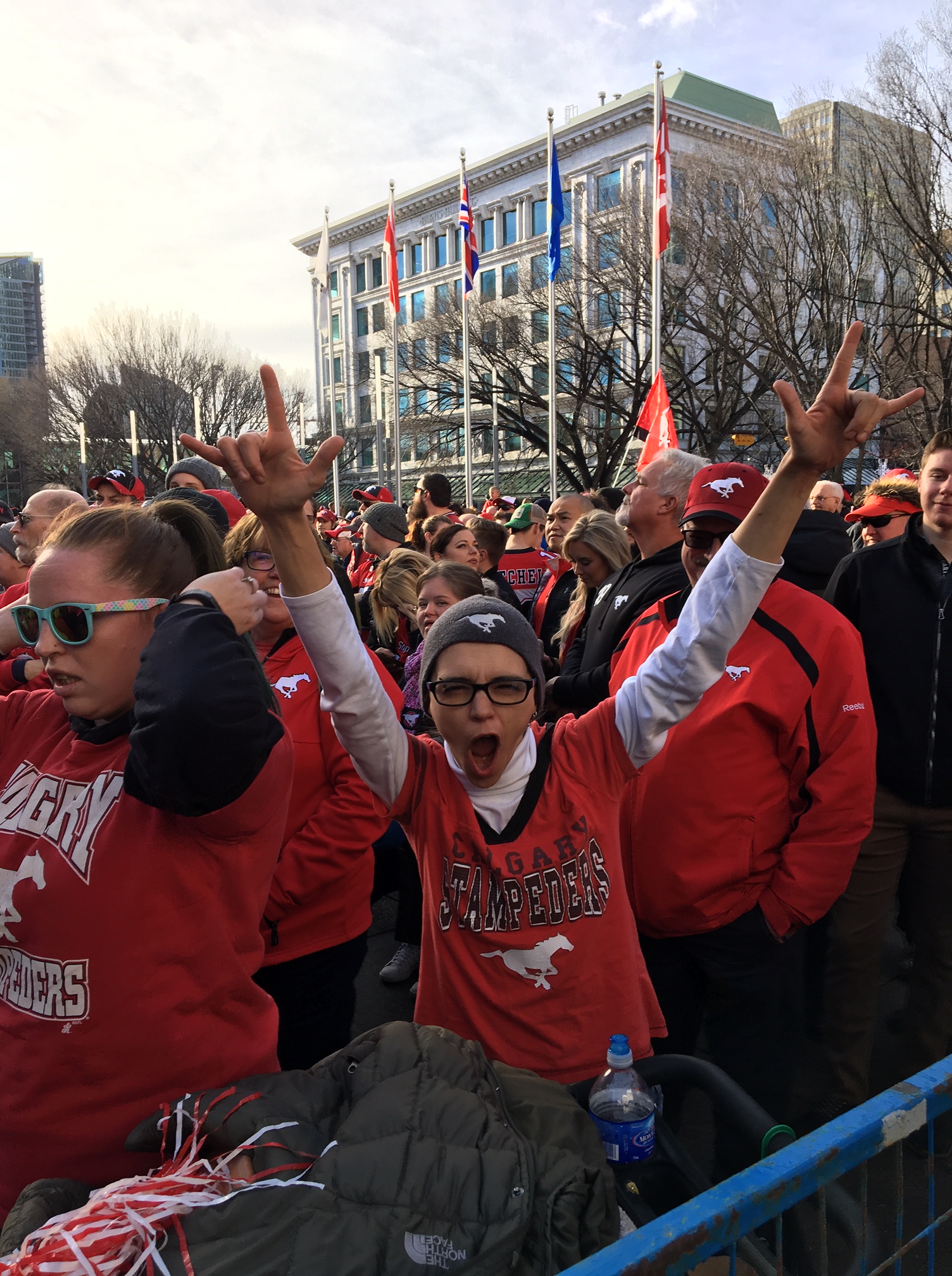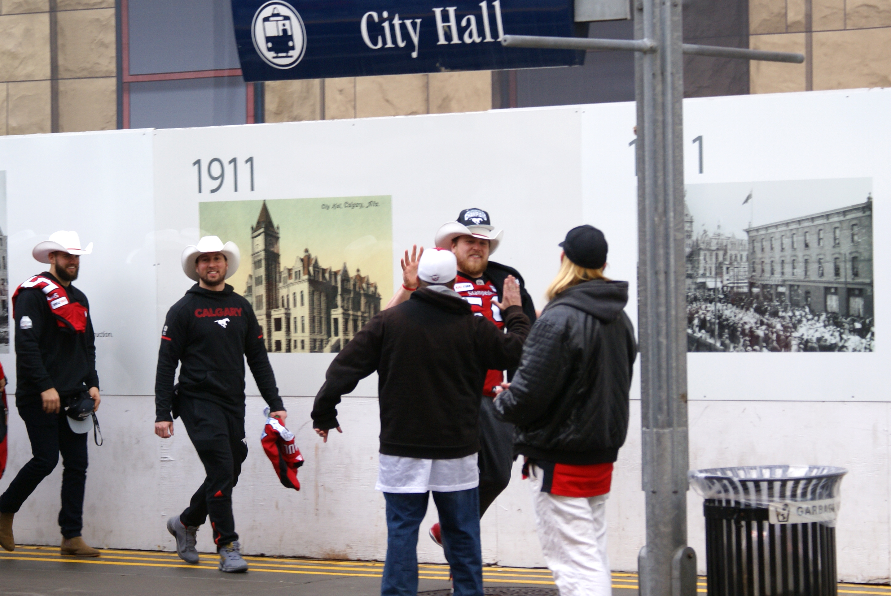 At noon, fans congratulated their team on the win, enjoying a festival-like atmosphere with food trucks and with Macleod Trail closed in front of the Municipal Building.