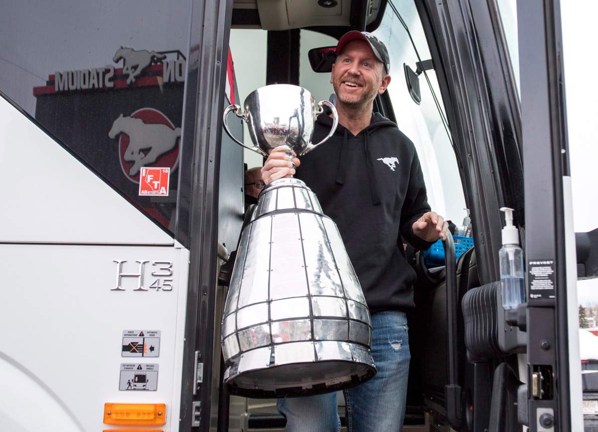 Tired but happy Stampeders filed off the buses at McMahon Stadium with the Grey Cup in tow on Monday.