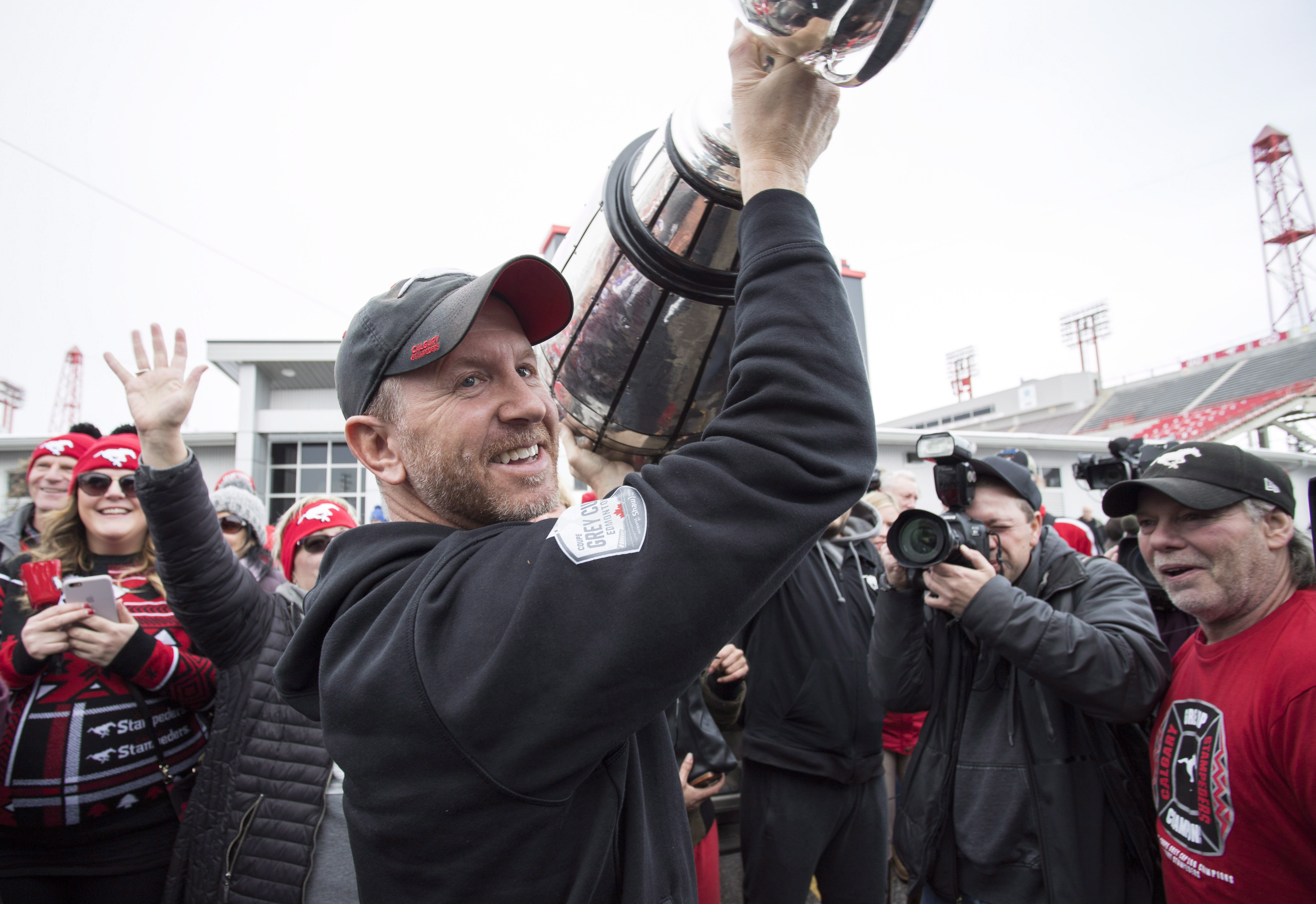 WATCH: Stampeders head coach pokes fun at himself during Grey Cup celebration.
