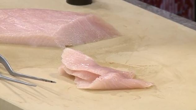 Slice Hamachi on a clean cutting board with a sharp knife into 1⁄4” slices, place on a plate in the cooler