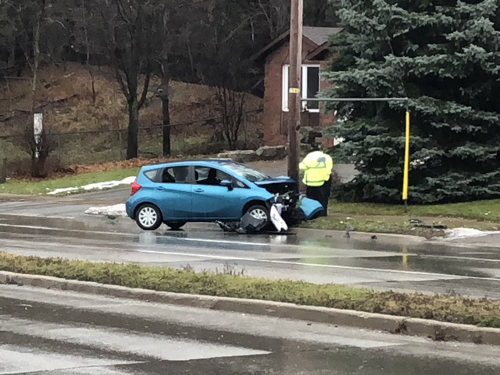 Emergency crews were called to the scene on Kortright Road at around 12:45 p.m, after the small hatchback hopped the curb and struck a pole, according to a police spokesperson.