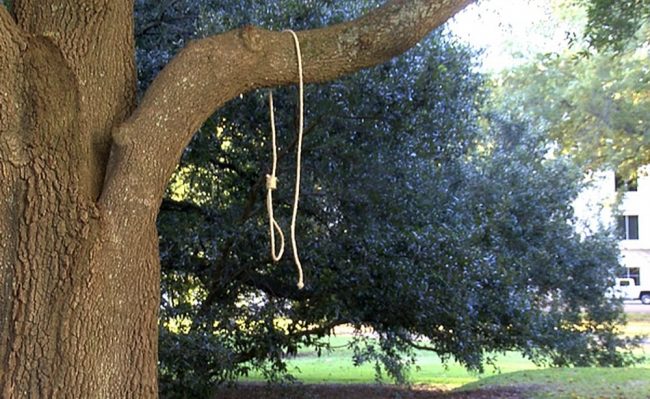 WLBT-TV showed photos of the nooses hanging over tree limbs, and described the rest as “hate signs.”