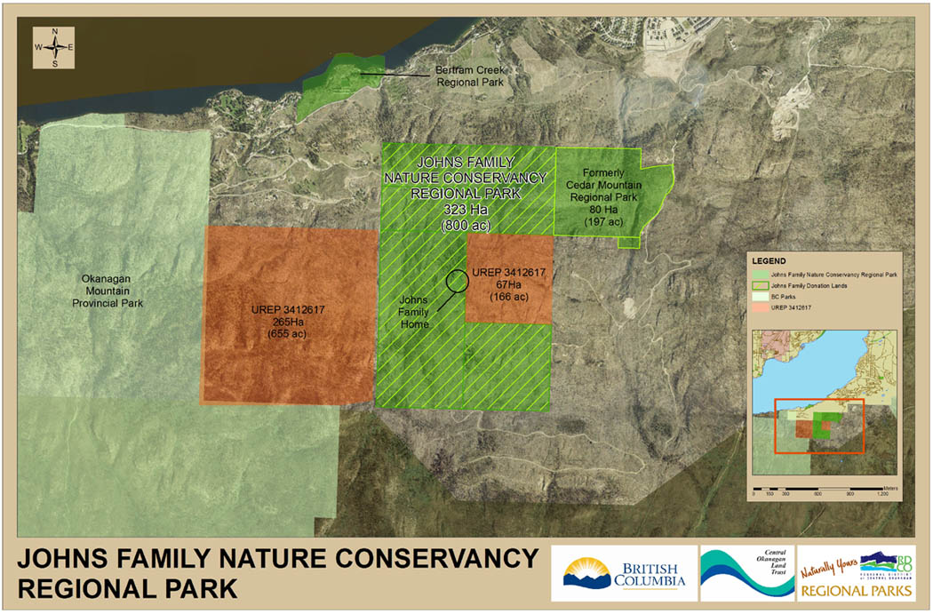 The Regional District of Central Okanagan says the estate of Alfred and Nancy Johns has donated more than 300 hectares of land adjacent to the Cedar Mountain Regional Park.