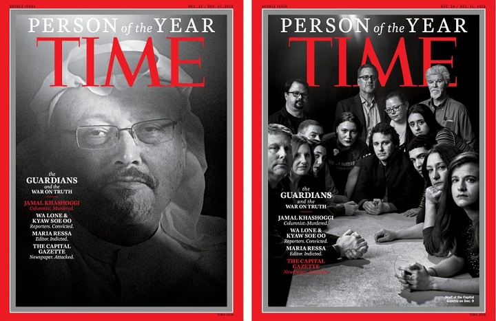 Four different covers of the magazine show prominent journalists who’ve been targeted as a result of their work, including Saudi critic Jamal Khashoggi who was murdered earlier this year.