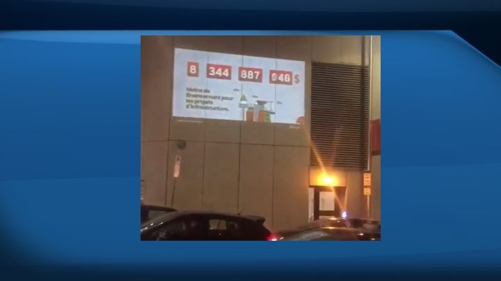 The projection shows a tree and one or two buildings. Next to this image, what appears to be a construction crane begins moving downwards. The projection also shows the number $8,344,888,060 and includes a message in French: “Moins de financement pour les projets d’infrastructures,” which roughly translates to: “That’s $8.3 billion less in financing for infrastructure projects.”