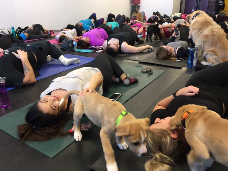 An added bonus of the class is that all the puppies involved in the yoga session are also up for adoption.