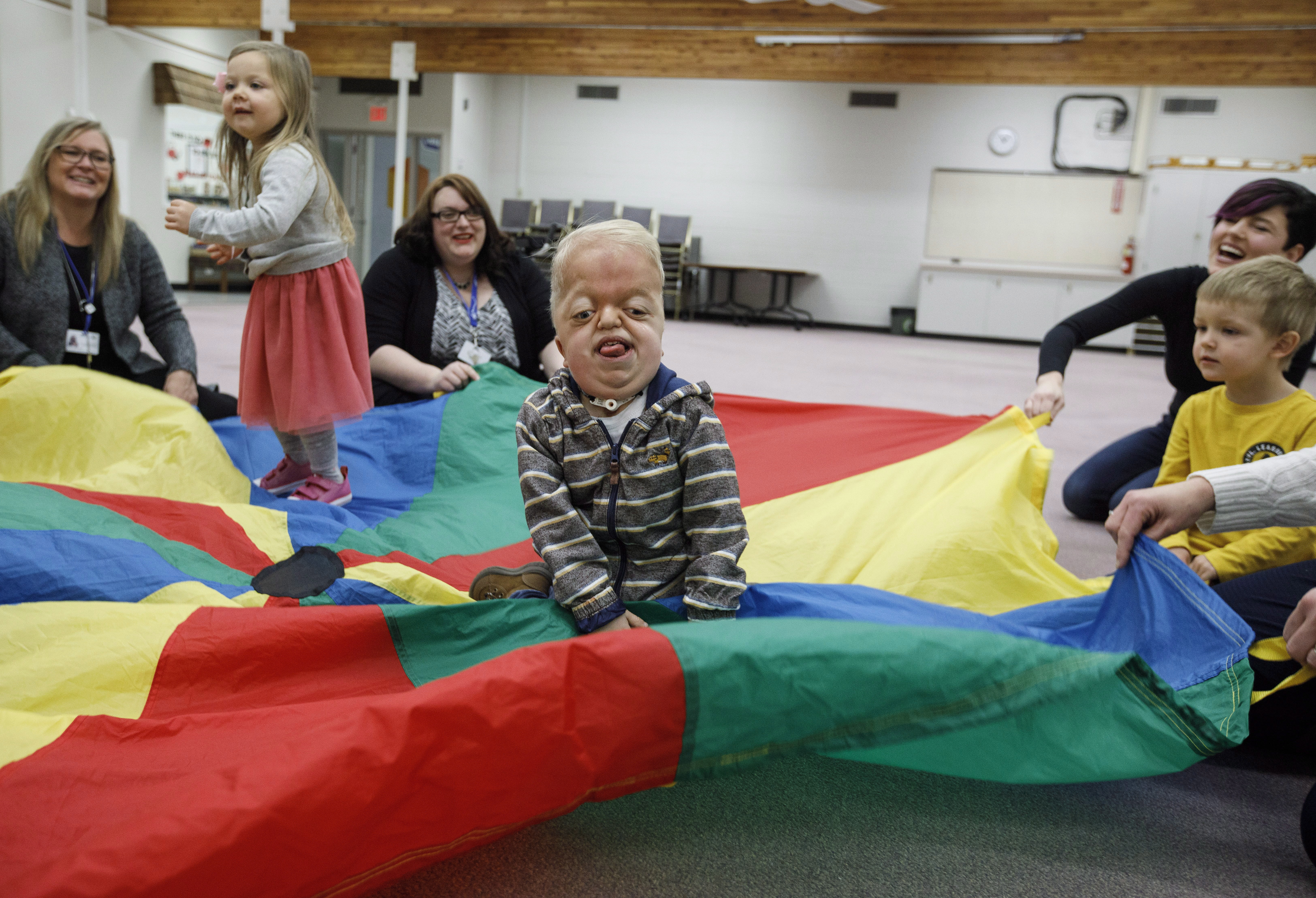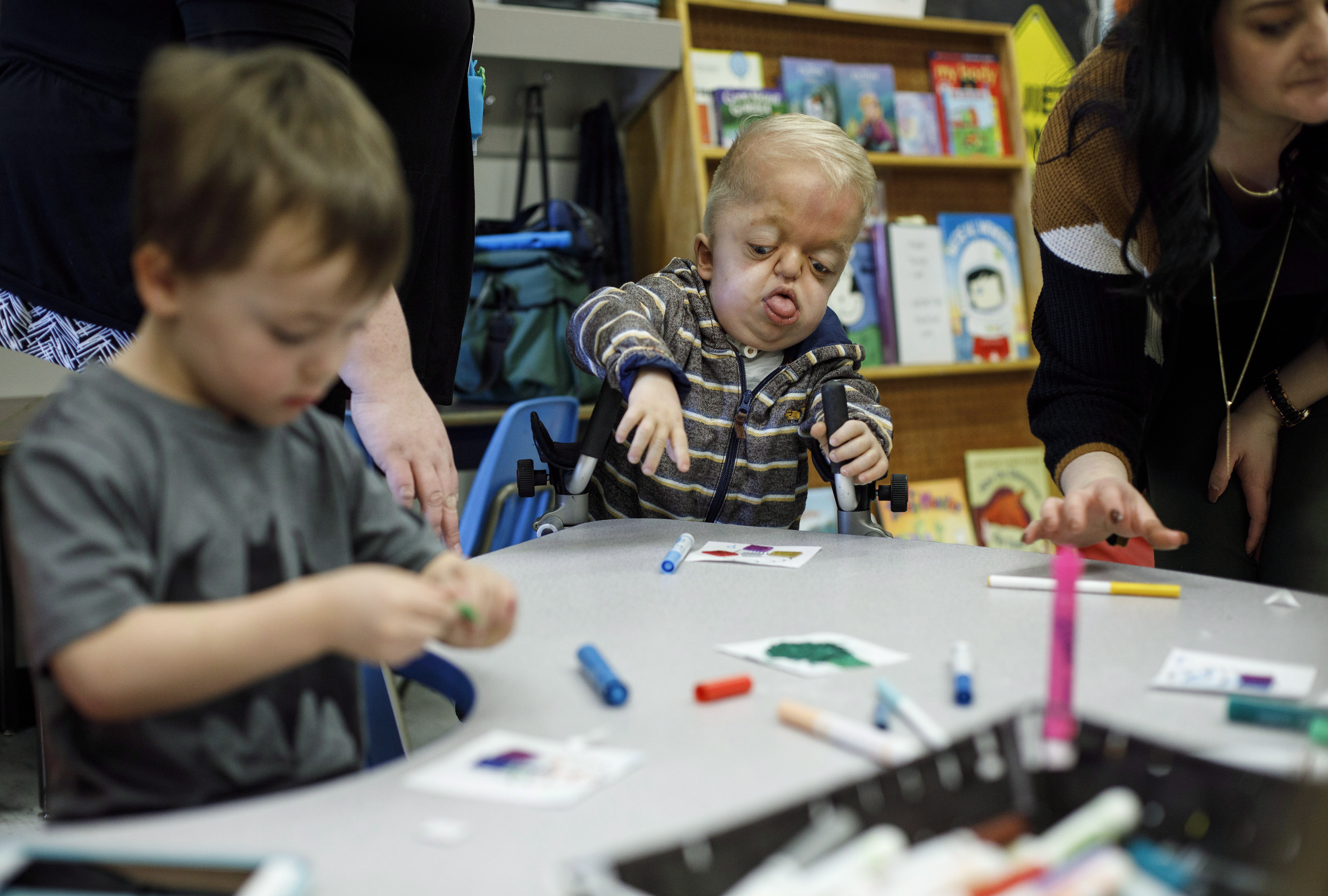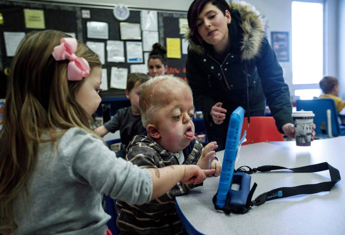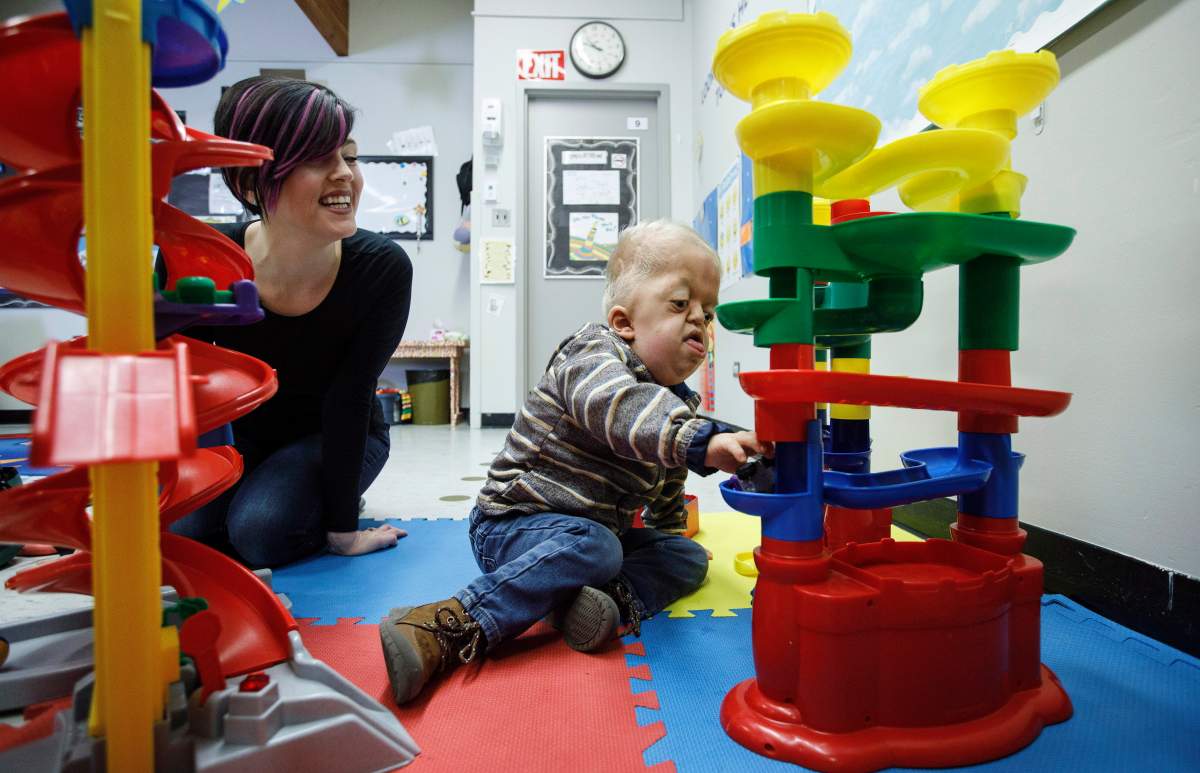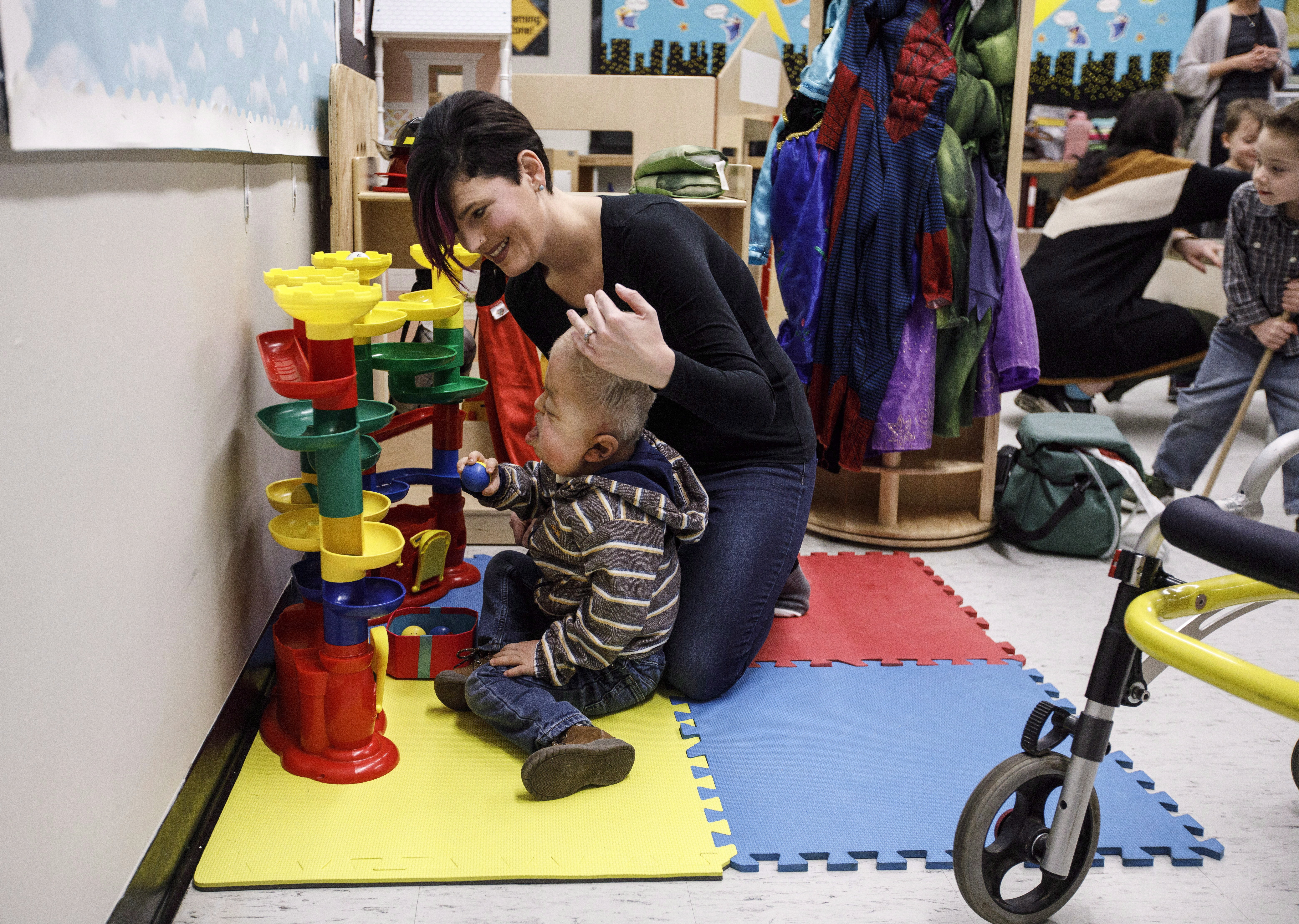 Four-year-old Porter Stanley has some new pals at preschool. Russ stands beside him as they manoeuvre toy cars down and around a plastic parking garage. The newest kid in class, Mimi, offers her hand, patiently waiting for Porter to give her a high- five.