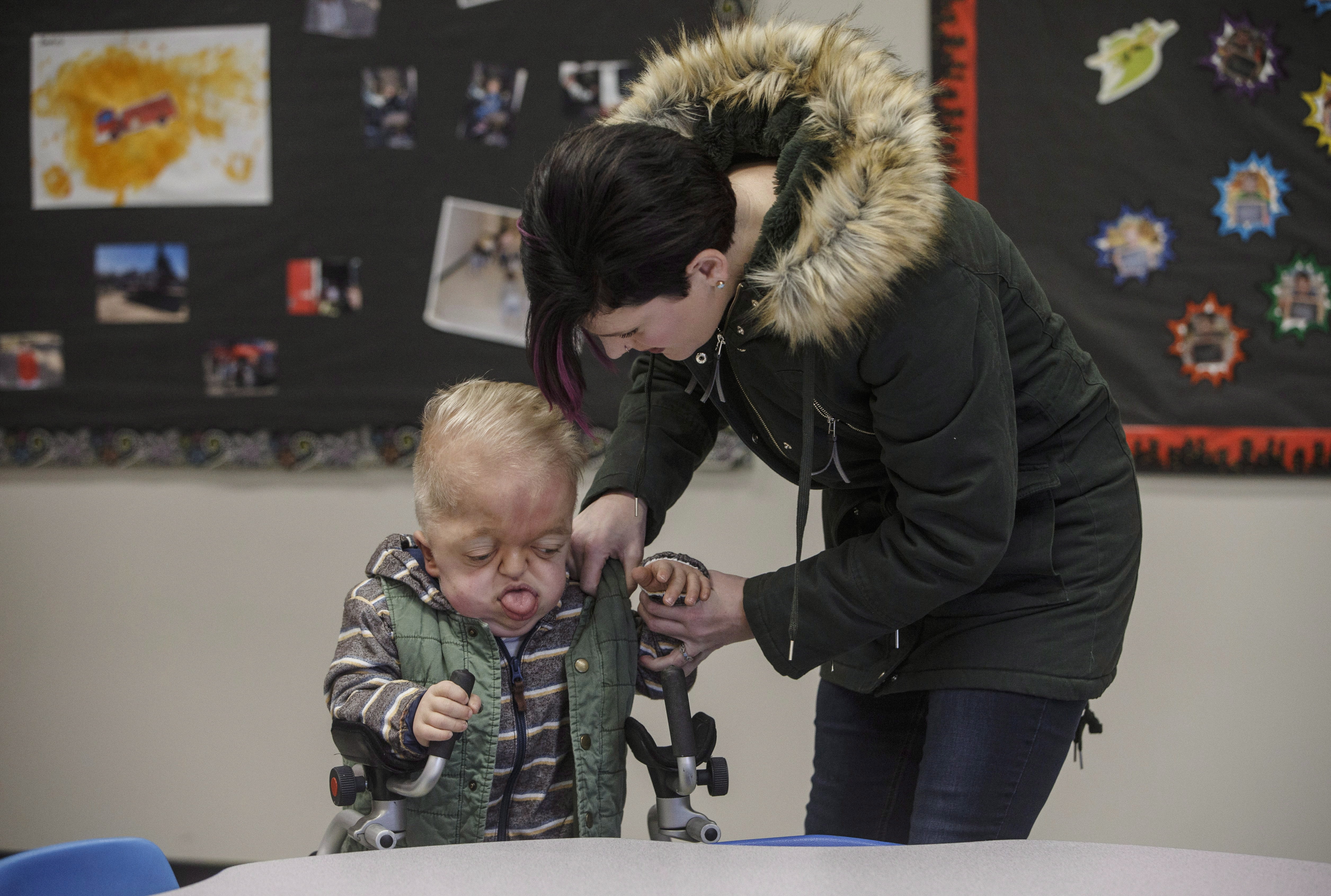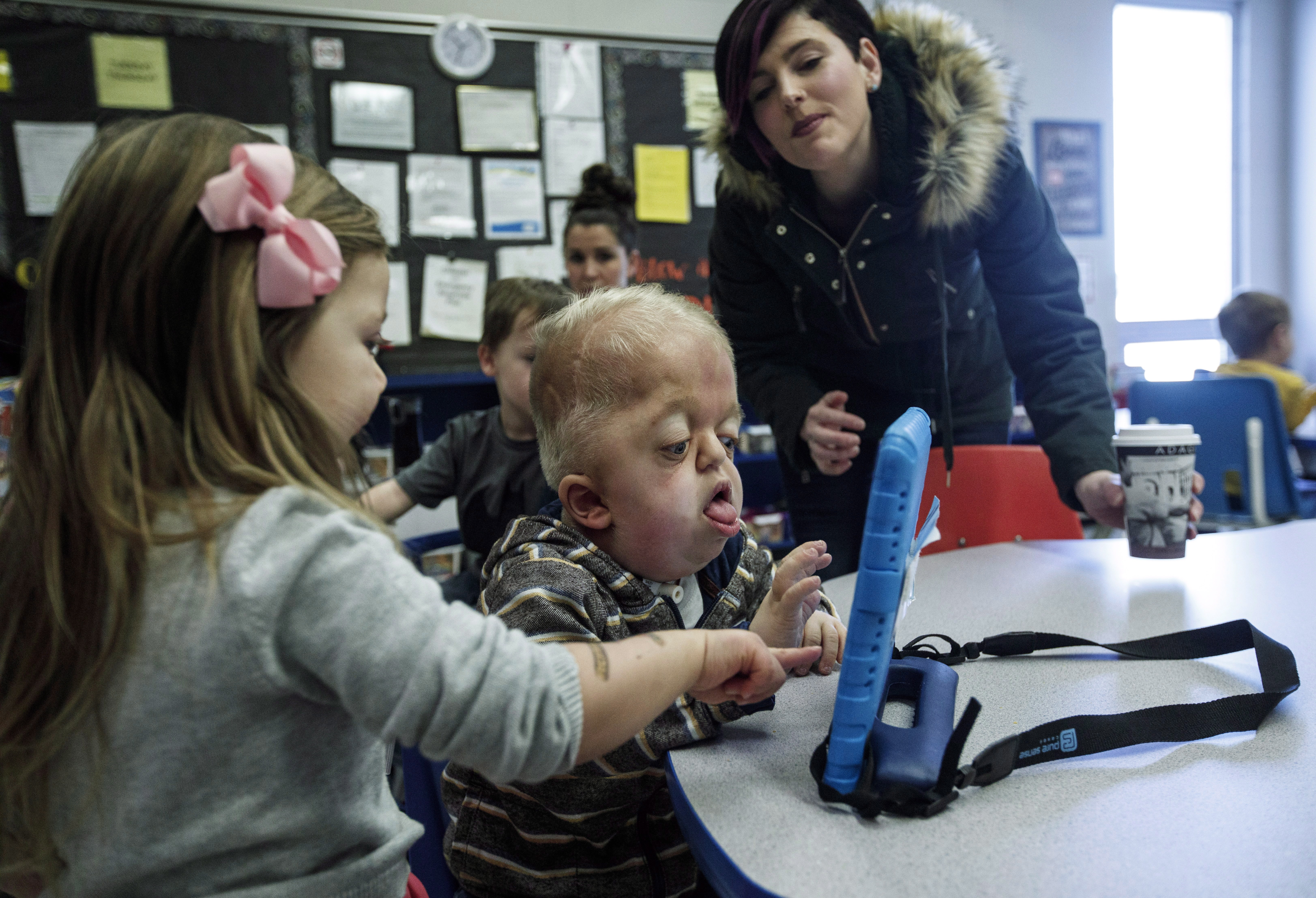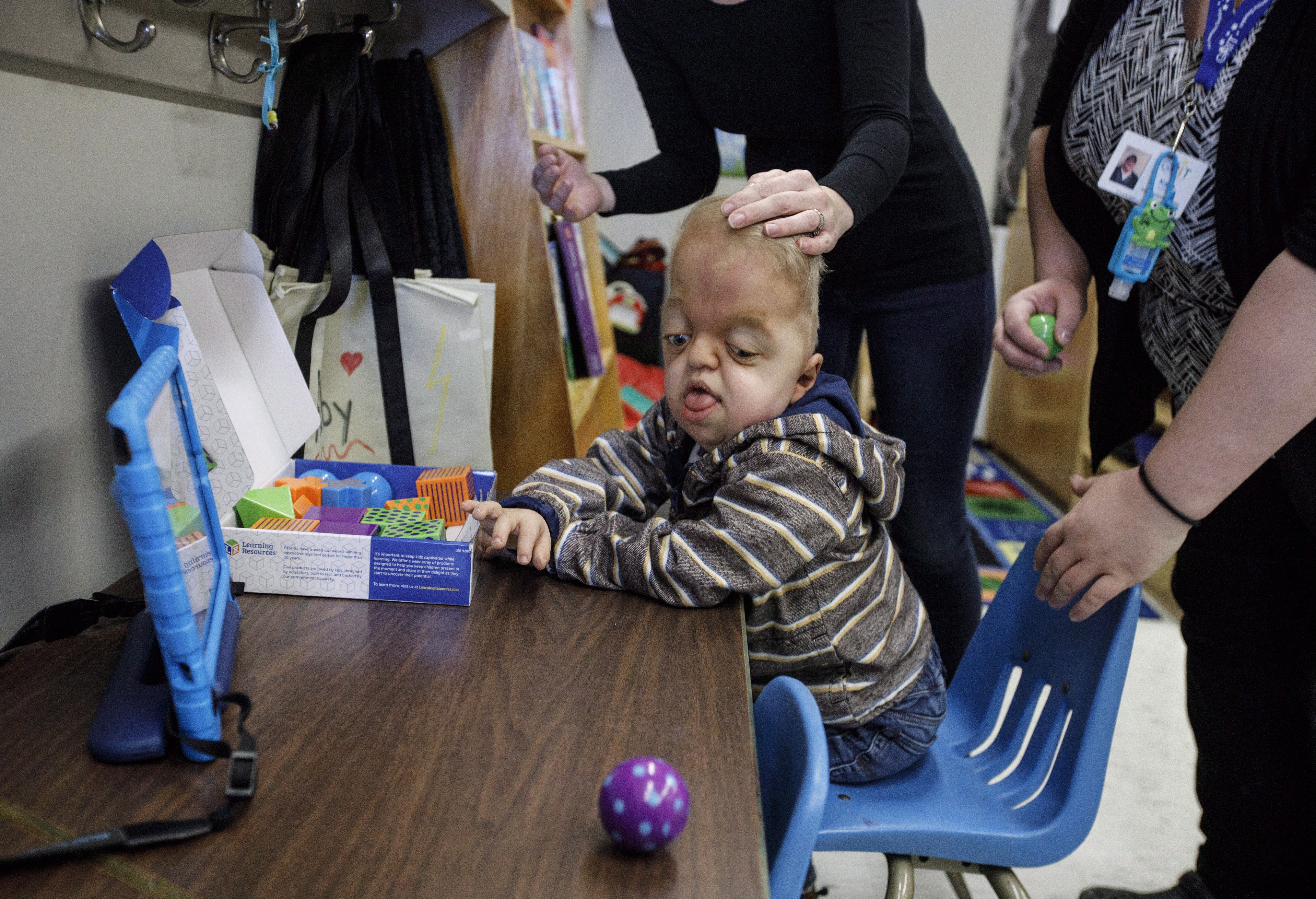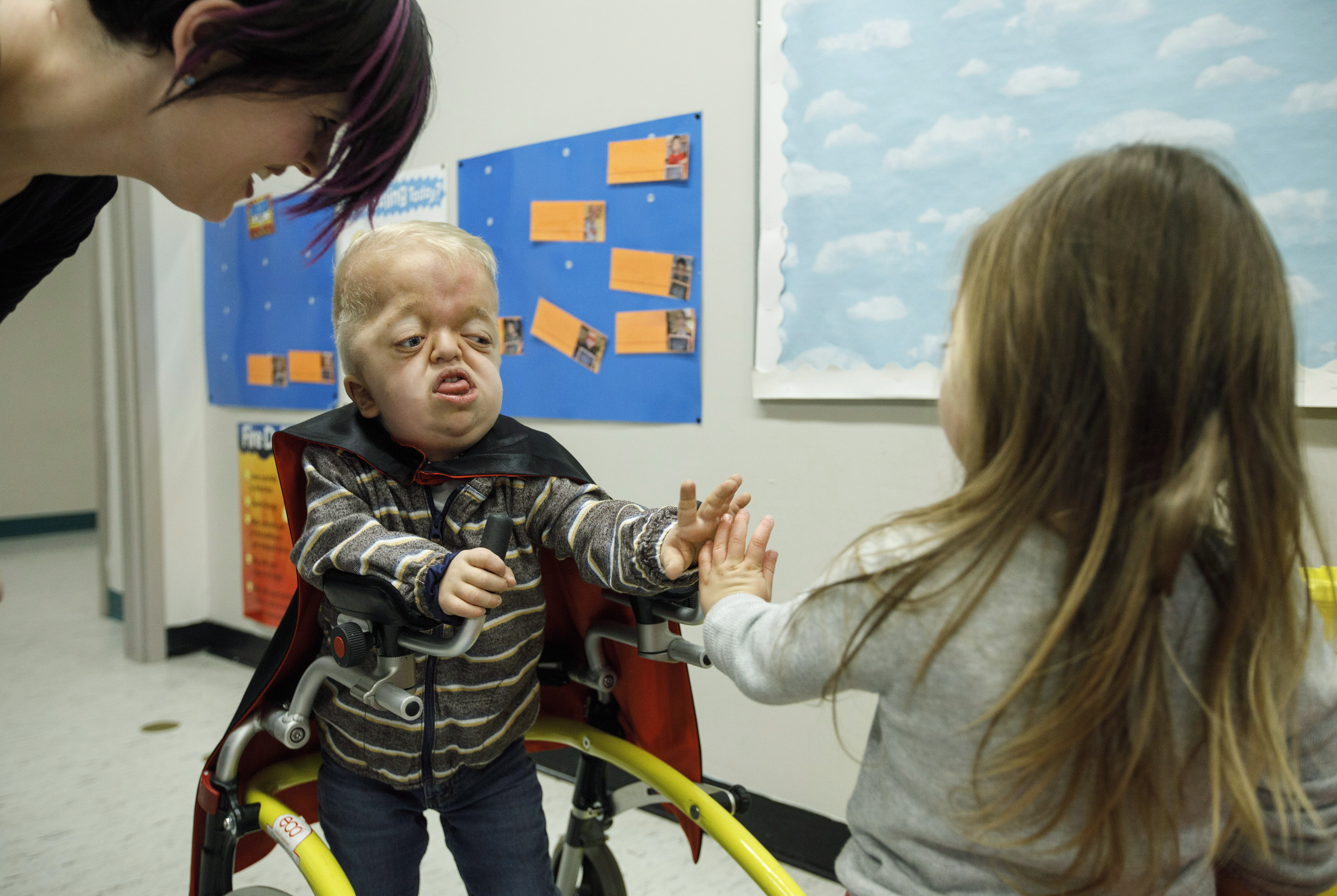Porter’s head and face are misshapen. He uses a walker to get around. There’s a tracheotomy hole in his throat that helps him breathe, but leaves him only able to communicate by touching pictures on a computer tablet.