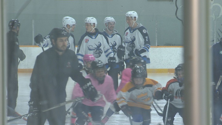 Several members of the Moose were at the St. Norbert Community Centre to teach some tricks of the trade. Nelson Nogier, Logan Stanley, Logan Shaw, Tye McGinn and even mascot Mick E. Moose were coaching up the seven- and eight-year-old South Winnipeg Storm girls’ team.