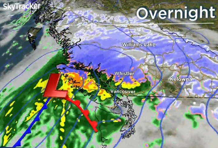 A Pacific storm is battering B.C.’s coast, and the weather warnings stretch from Vancouver Island, where winds could reach 110 km/h, to the West Kootenays, which, along with several other Interior regions, is under a snowfall warning.