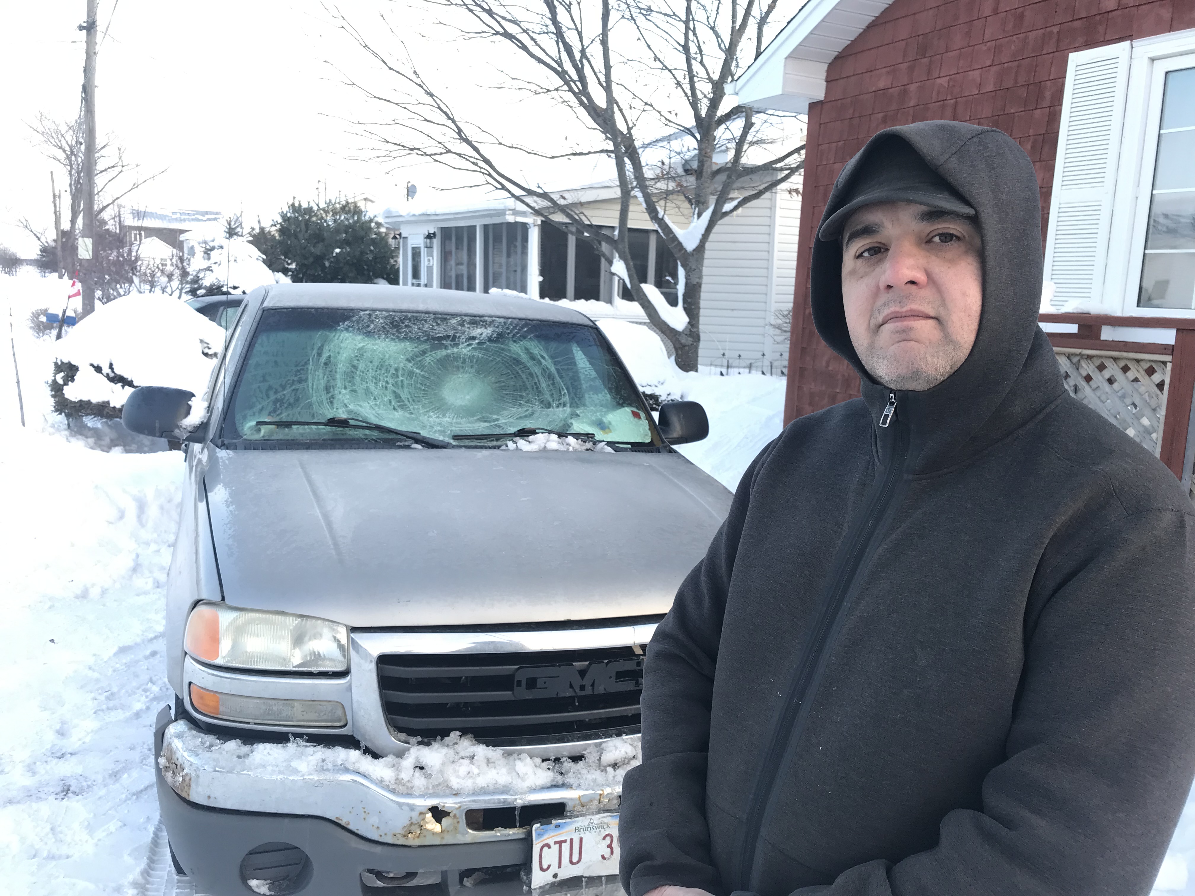 He claims a provincially-owned snow plow travelling ahead of him on the Harrisville Boulevard overpass is what did the damage.
