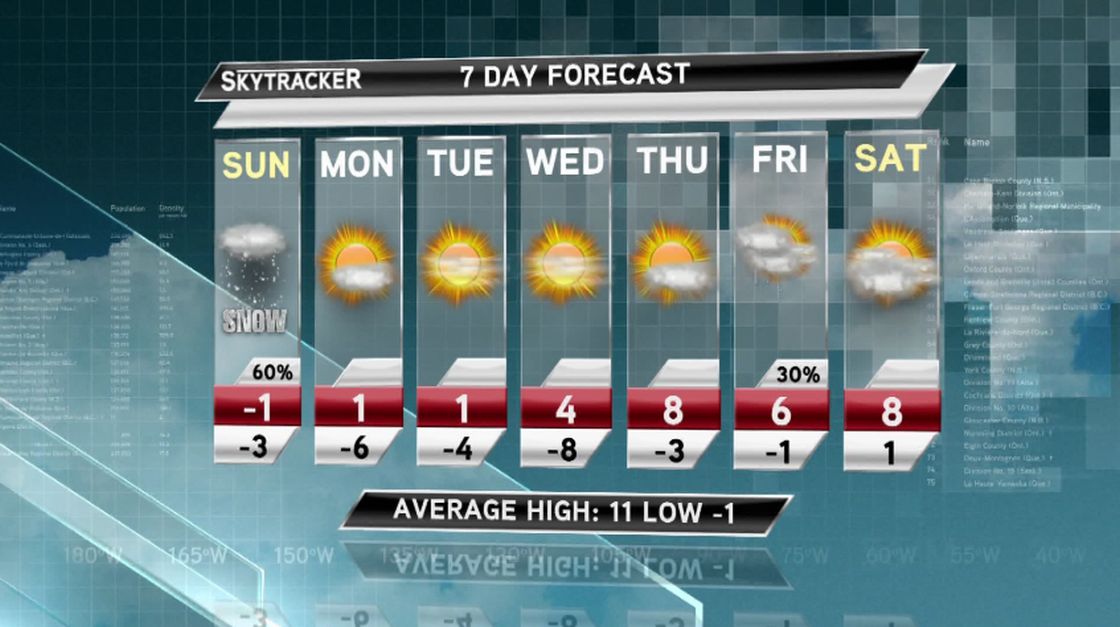 A high of zero degrees celsius is expected for Saturday, with light snow to fall throughout the day. Similar conditions are expected for Sunday, with a slight improvement into next week.