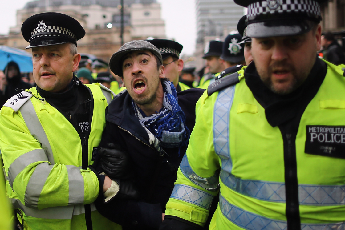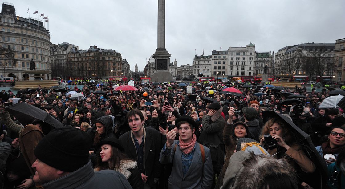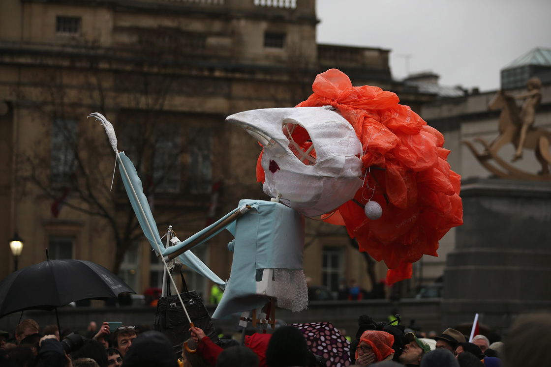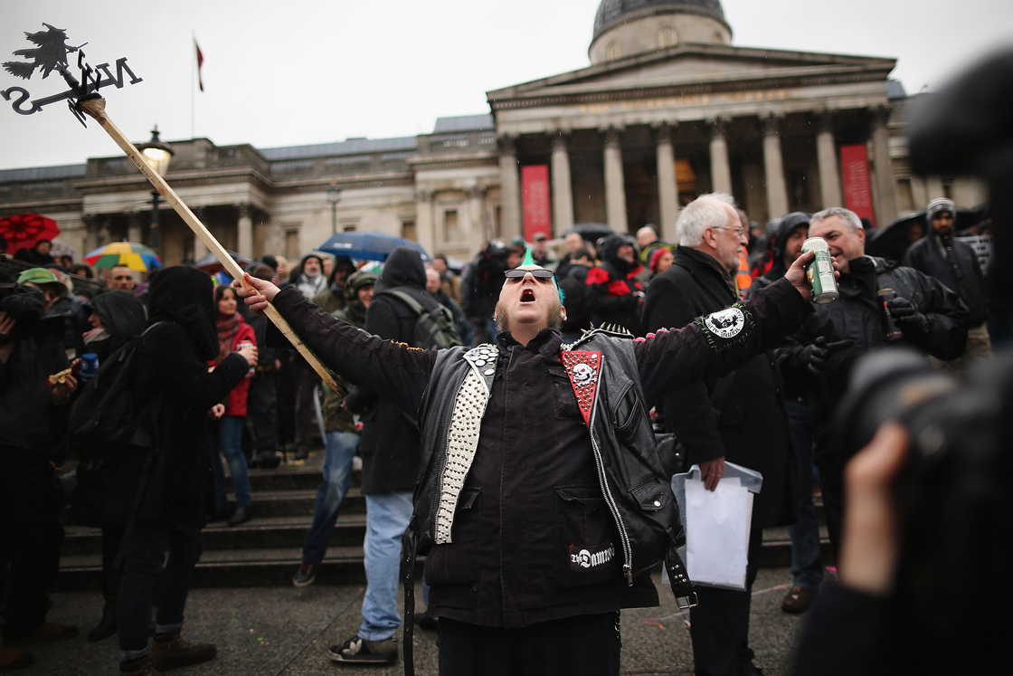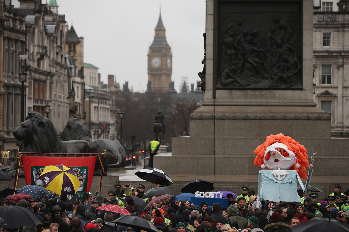 Photographs and video footage appeared to show a few hundred people clutching their umbrellas in the rain between Nelson’s Column and London’s National Gallery.