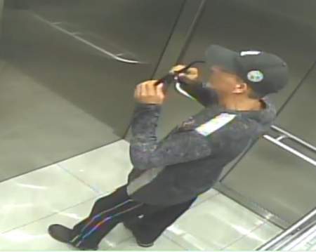 The photo released by police shows a man standing in what appears to be an elevator. He is wearing a dark baseball cap and dark clothing.