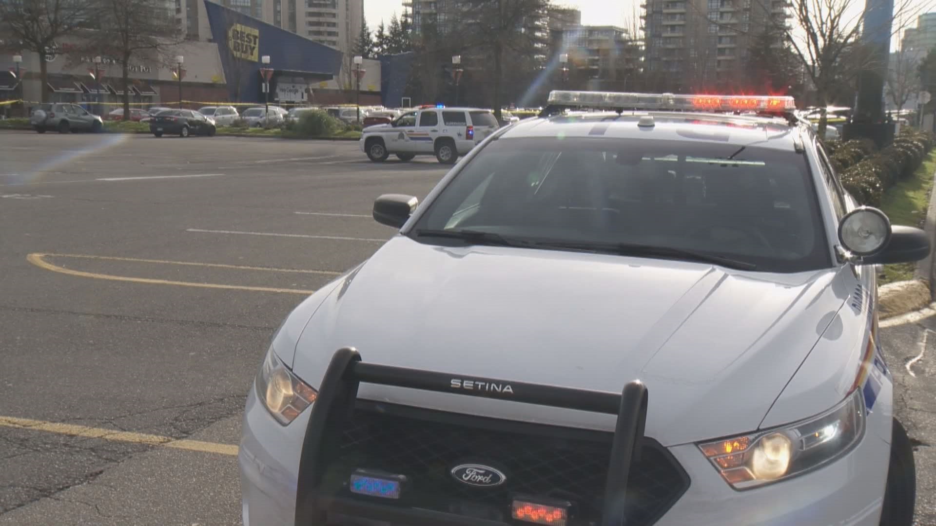 Part of the shopping centre parking lot is cordoned off while police investigate.