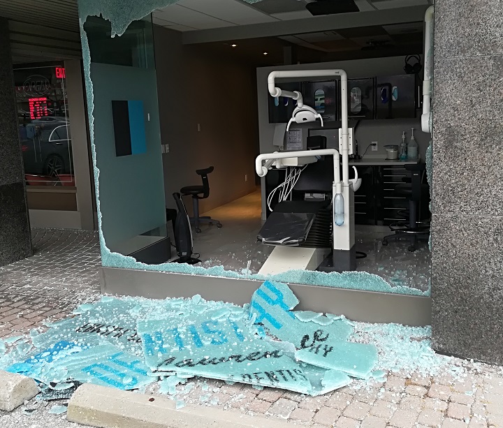 The window of a dentist office in the plaza was also shattered in the shooting.