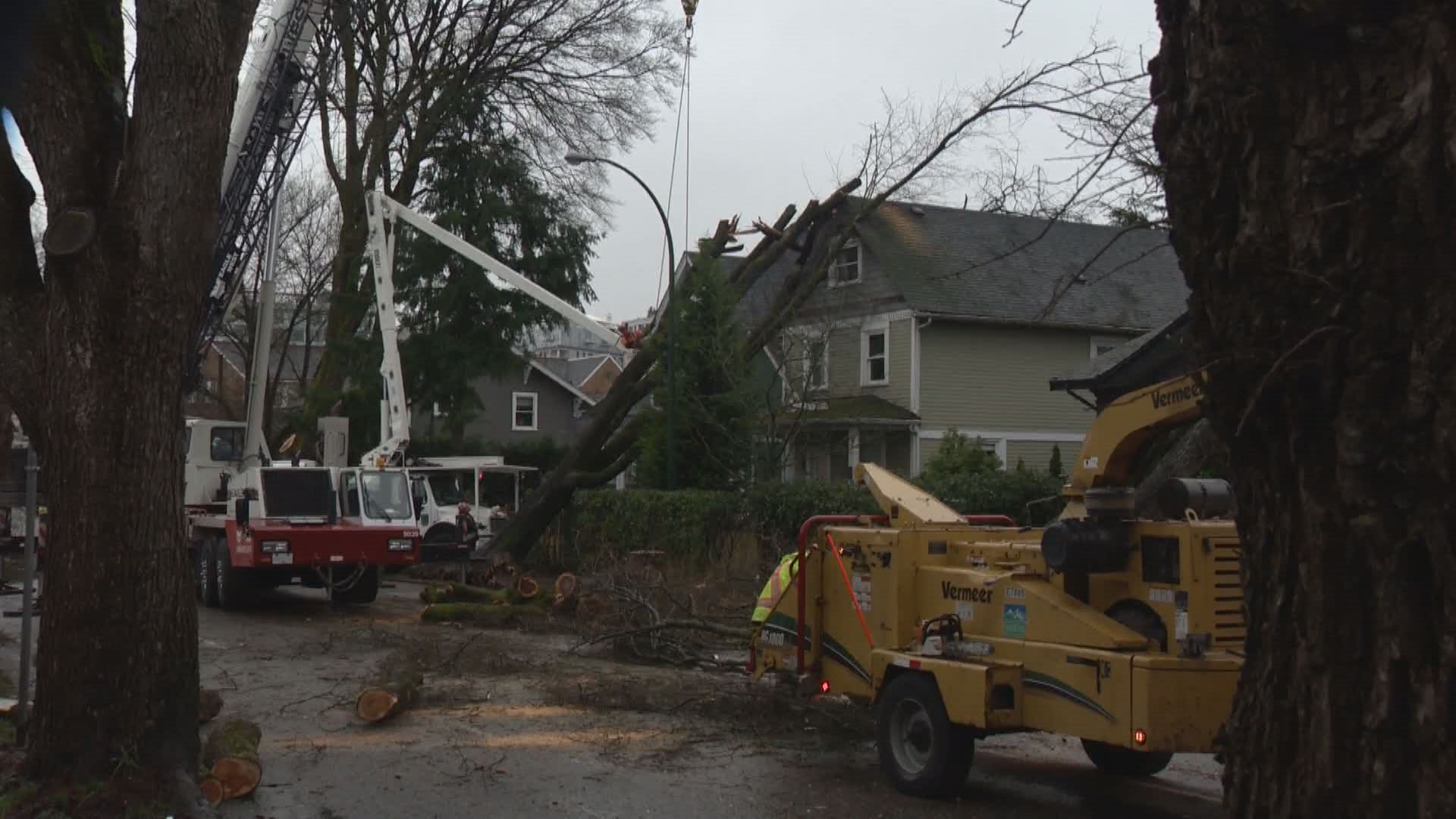 In Vancouver, 12th Avenue remained closed between Kingsway and Fraser Street, while crews worked to clear several large trees that fell on two houses and remove another that remained standing but was unstable.