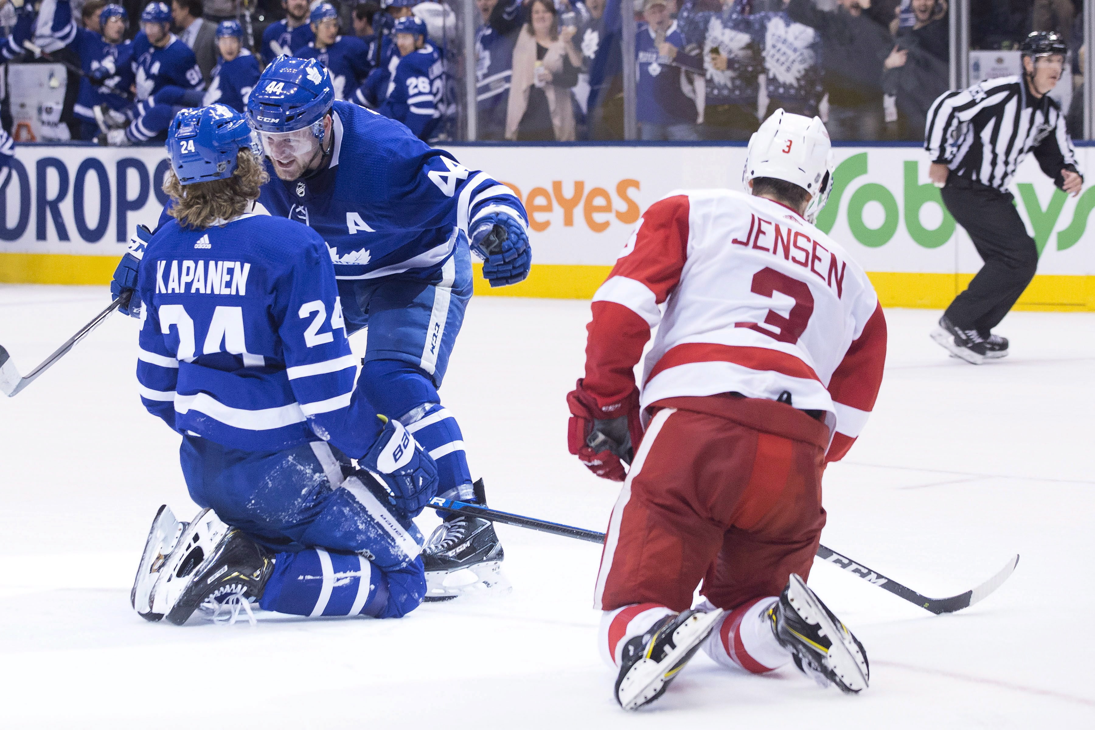 Toronto got off to a fast start when Kapanen outmuscled Red Wings defenceman Trevor Daley – playing the 1,000th game of his NHL career – to bang home his 13th just 27 seconds into the first.