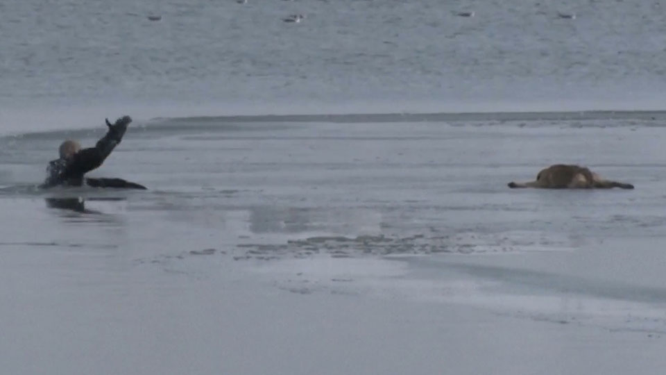 A police diver braved a frozen lake on Wednesday to save a puppy stuck on the ice and clinging to life.
