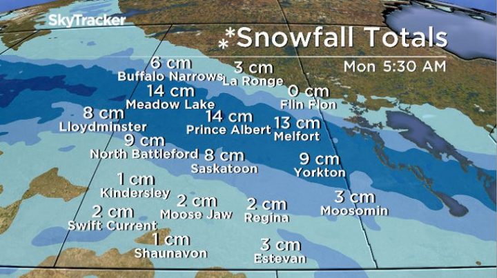 Light flurries will hold on tonight as well. It won’t cool off much more than what Saskatoon experienced today – temperatures overnight will dip to -14 degrees, feeling more like -20 with the winds. Snow accumulations are about 2 cm.