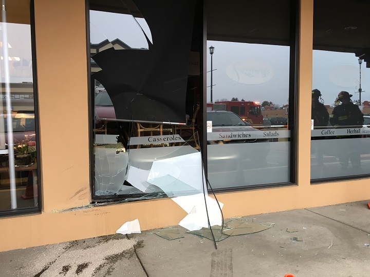 The accident took place at Fezziwig’s Bakery Café, located in the Mission Park Shopping Centre at Richter Street and KLO Road, at approximately 11:30 a.m. Emergency crews were on scene and a tire mark could be seen on the concrete sidewalk in front of the restaurant. The collision shattered one large pane of glass, and damage to the front of the café could be seen.