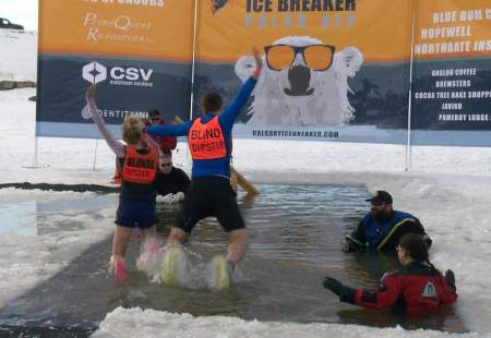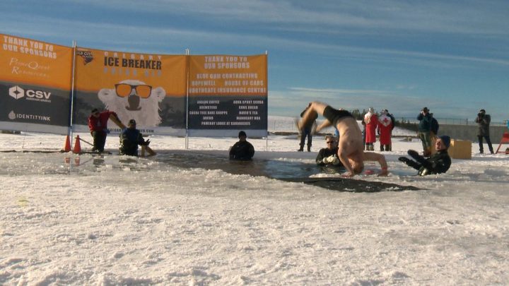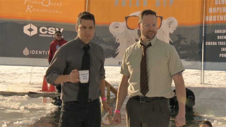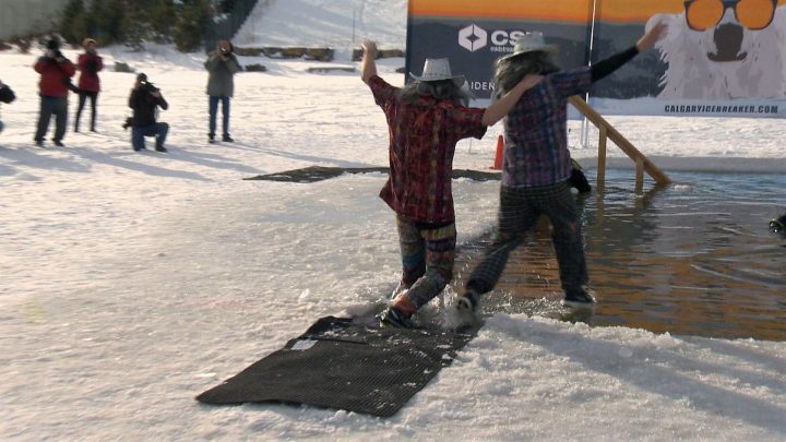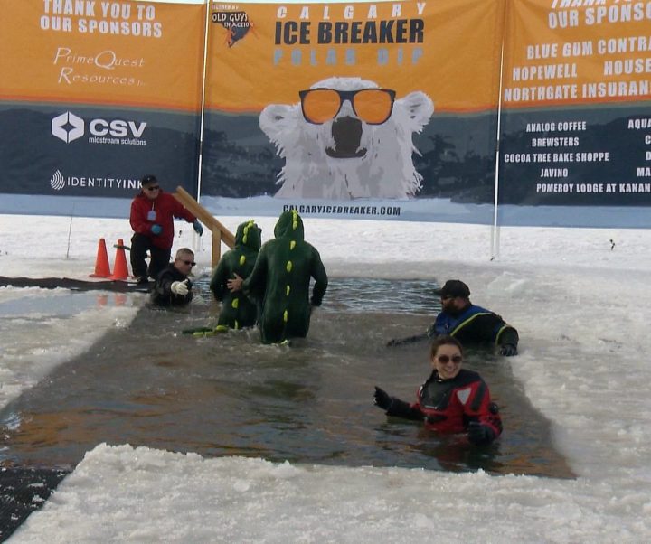 Ross Weaver and Bernie Potvin, co-founders of Old Guys in Action and the Calgary Icebreaker Polar Dip, hopped in the water first to make sure the temperature was cold enough.