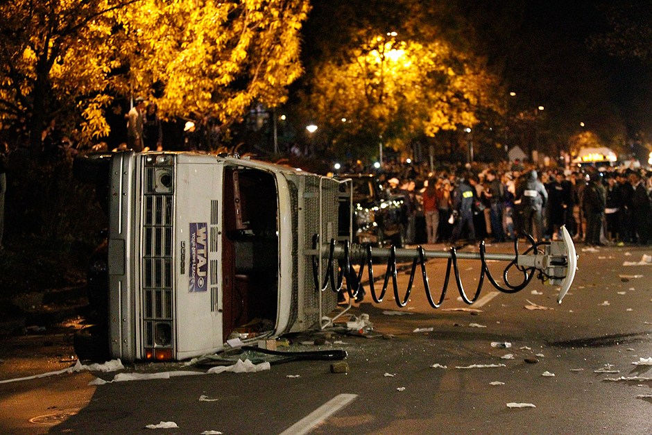 toppled a television news van and at least one photographer was pelted