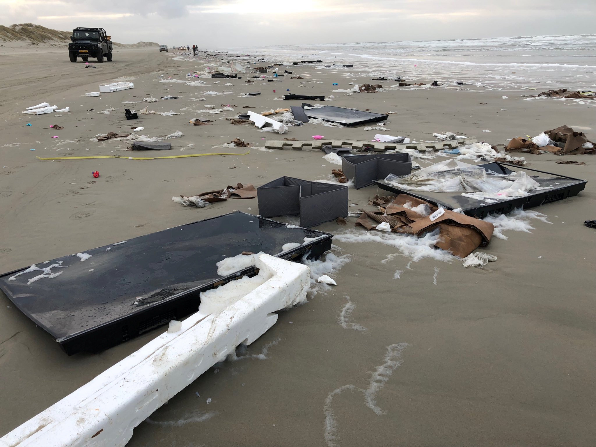 Containers broke open on the shores of the Dutch islands of Terschelling and Vlieland. Others were floating or stranded off the coasts of Ameland and Schiermonnikoog, part of a chain of islands that guard the Dutch coast.