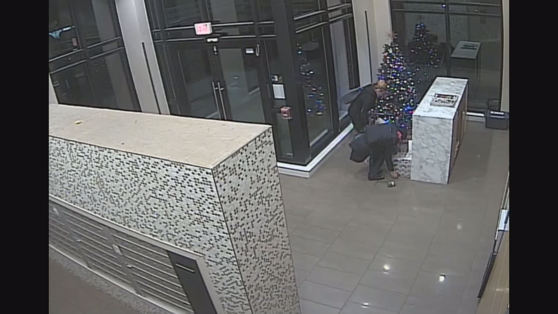 In the video, two people with a stroller can be seen entering the lobby, making a bee-line for the boxes, and loading them into the carriage. The pair then grab a second box before fleeing out the doors.