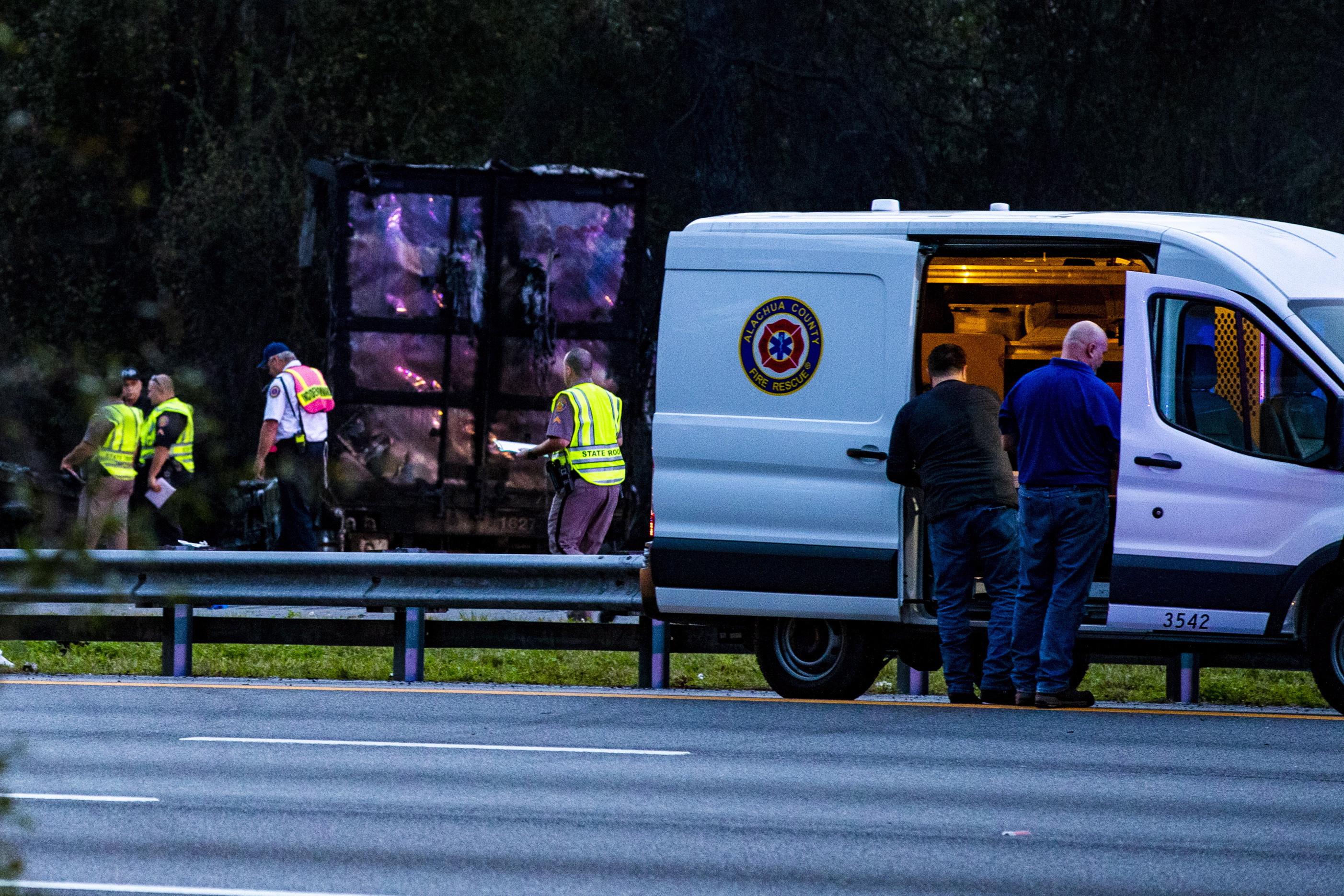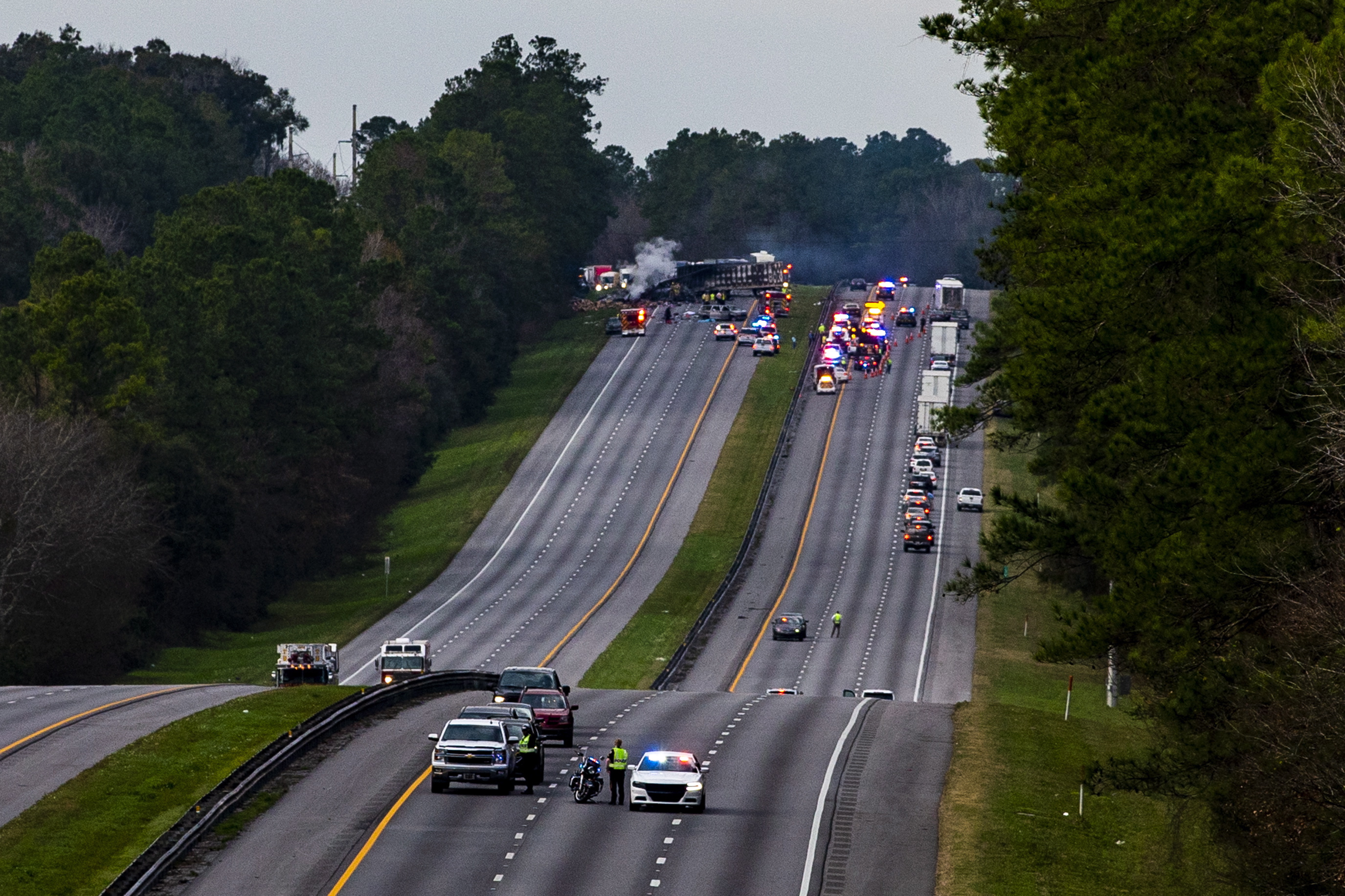 Nicole Towarek was traveling northbound with her family when they came across the scene. She told the Gainesville Sun that black smoke billowed, people were laid out near vehicles, there were long skid marks across the roadway and emergency workers were converging on the area.