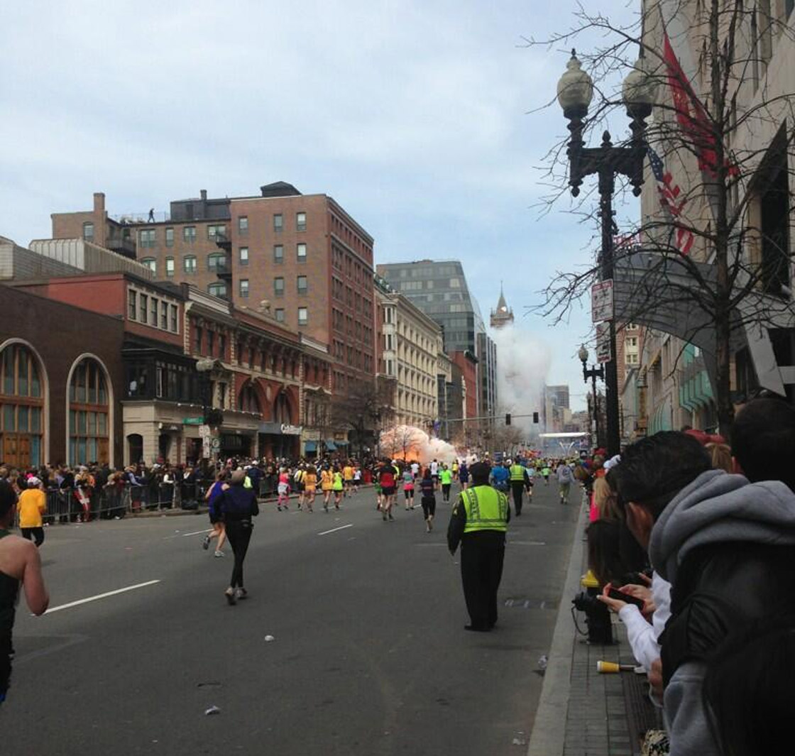 The fiery twin blasts took place about 10 seconds and about 100 yards apart, knocking spectators and at least one runner off their feet, shattering windows and sending dense plumes of smoke rising over the street and through the fluttering national flags lining the route. Blood stained the pavement, and huge shards were missing from window panes as high as three stories.