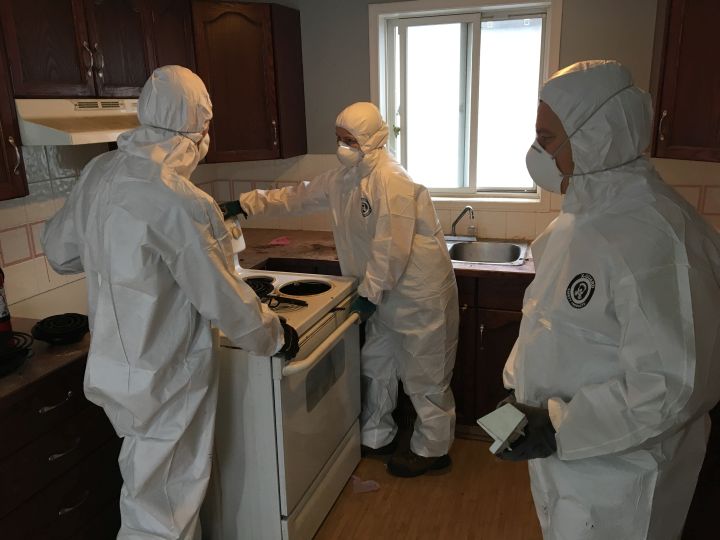 A cleaning crew outfitted in protective outfits was cleaning out the house on Monday.