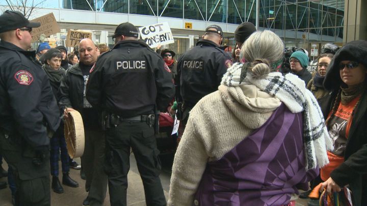 Amid rising tensions in northern B.C. – where Indigenous protesters are preventing a pipeline company from accessing an area in which it plans to work- dozens of people showed up at rallies in downtown Calgary and downtown Edmonton on Tuesday afternoon to show solidarity with members of the Wet’suwet’en First Nation.