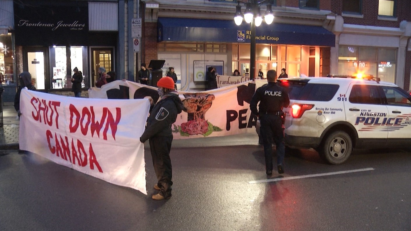 Those who gathered just before 5 p.m. on Tuesday in Kingston blocked a portion of downtown Princess Street in front of the RBC. A spokesperson for the group, who would not give their name or show their face, said the group chose to set up in front of the bank because the financial institution is advising one of the backers of the pipeline.