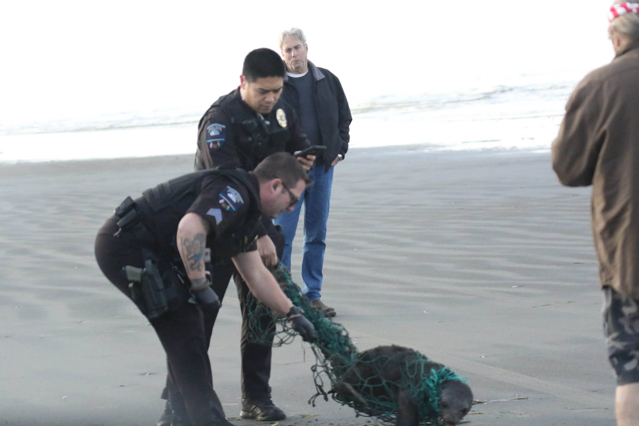 Local resident Steve Hill captured the rescue in Ocean Shores, Wash., on video, which shows the two officers working together to free the frightened seal from what appears to be a plastic fishing net.