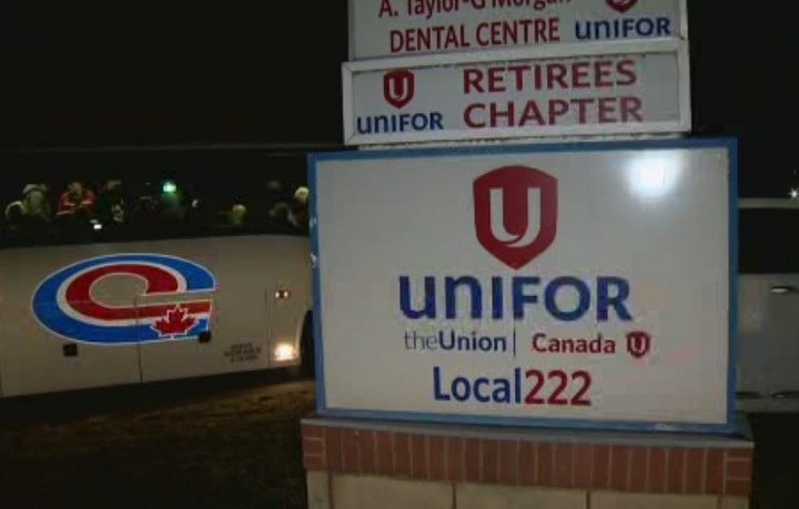 The union had bussed members in from Ontario communities several hours away, including Kitchener and Brampton. They gathered at GM’s Windsor headquarters to hold a rally during an investor’s meeting that was taking place in nearby Detroit, where the company announced its rosier financial prospects.