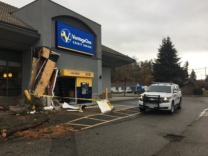 RCMP say a stolen Ford F350 truck was used to ram the outer wall of the VantageOne Credit Union in Peachland in an attempt to steal the drive-thru ATM. The attempted robbery took place at 5:23 a.m., with extensive exterior damage to the credit union.