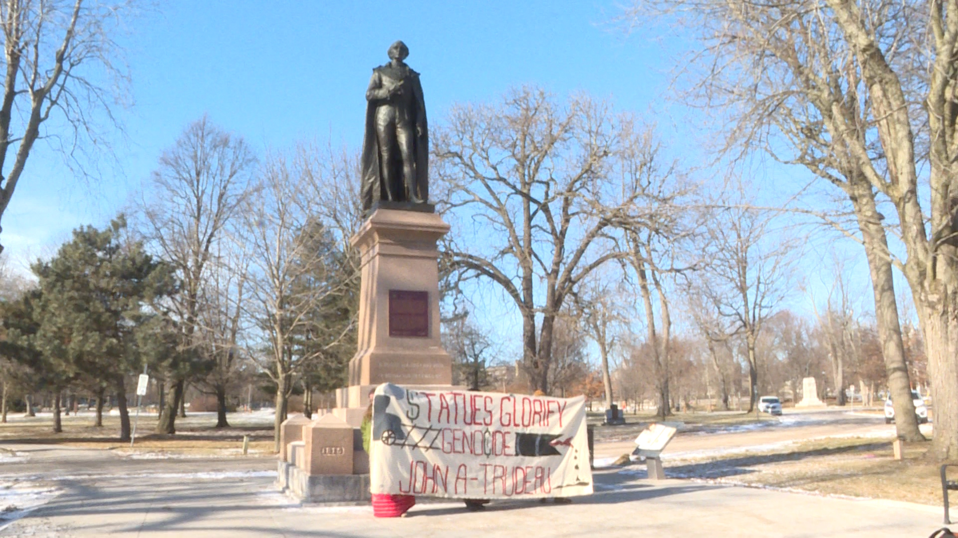 The group of maybe six people held a banner that read, “Statues glorify genocide: John A-Trudeau.”