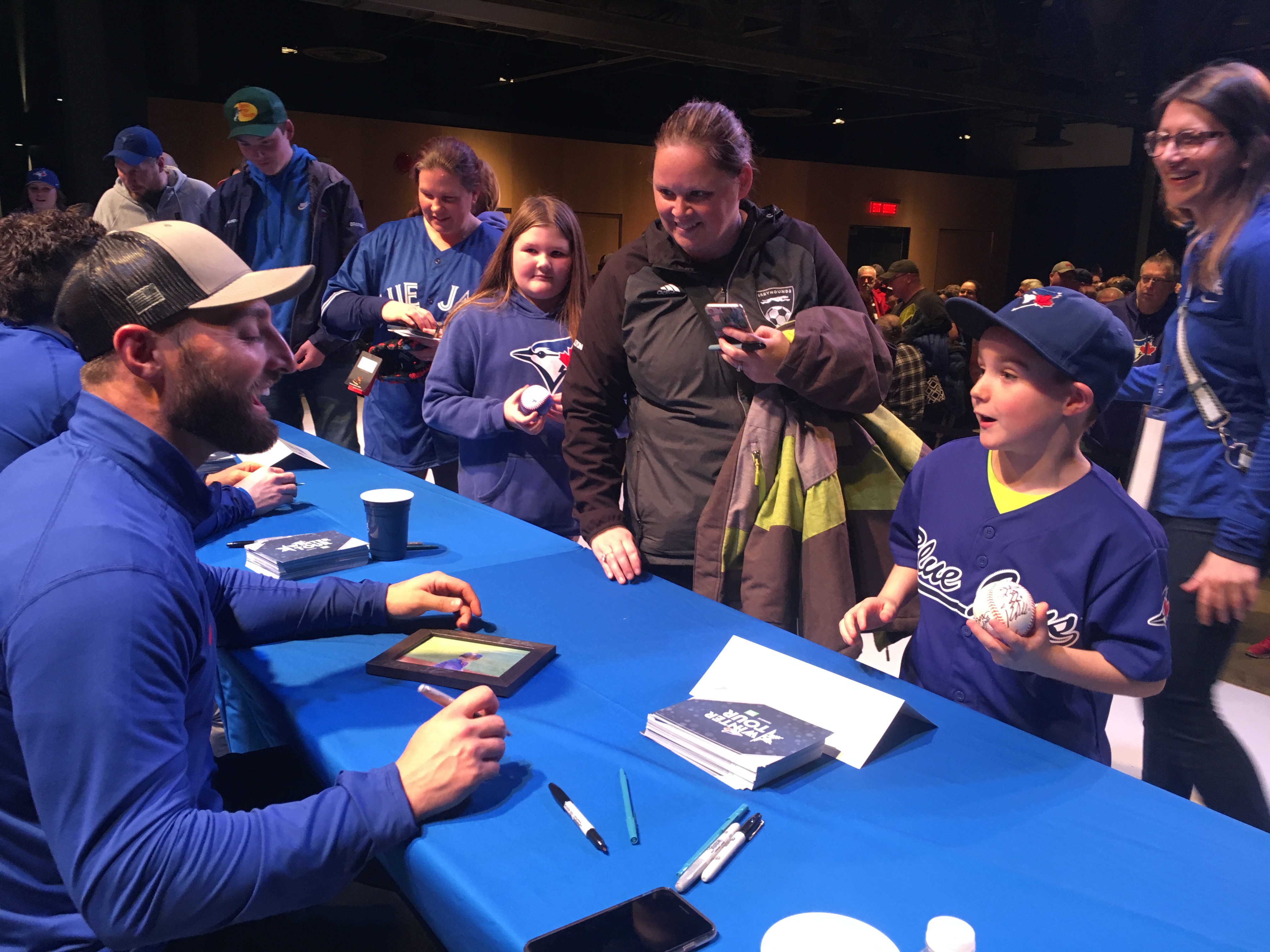 Kevin Pillar, Devon Travis, Luke Maile, Danny Jansen and Ryan Borucki inked their names onto hats, gloves, baseballs, bats and more. A crowd of about 500 lined up to see them — each member having won a random lottery in order to purchase their ticket.