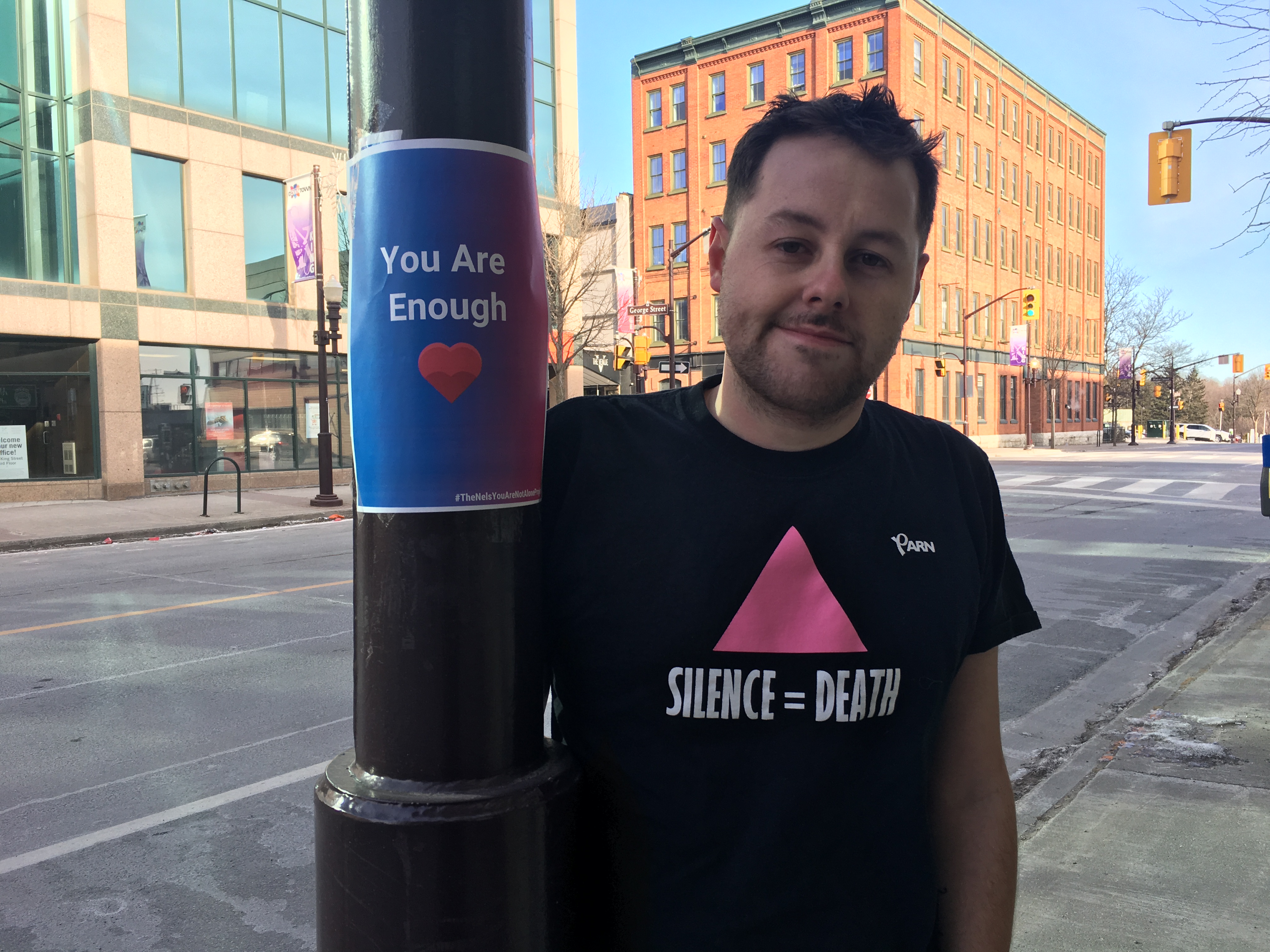 Just a week before Christmas, Nelson began plastering messages of hope and inspiration all around the city with colourful posters. “This sign here says, ‘Hey you, don’t give up’,” he said, “just as a reminder to not give up.”