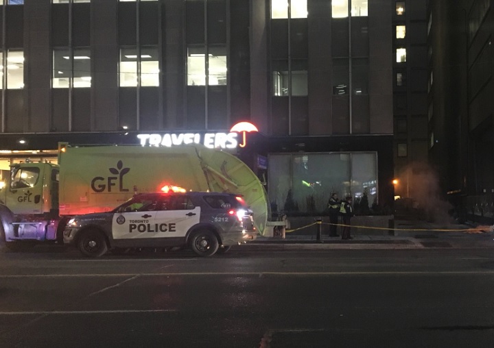 Toronto police say a person is dead after being struck by a garbage truck in downtown Toronto early Tuesday.