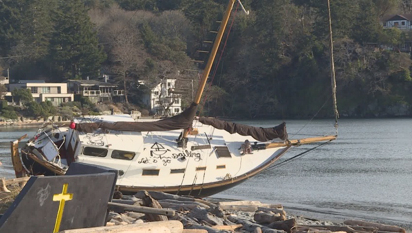 A ferrocement-hulled sailboat washed up on shore in the community of Cadboro Bay on the morning of December 21, and so far it has been impervious to all efforts to move it.