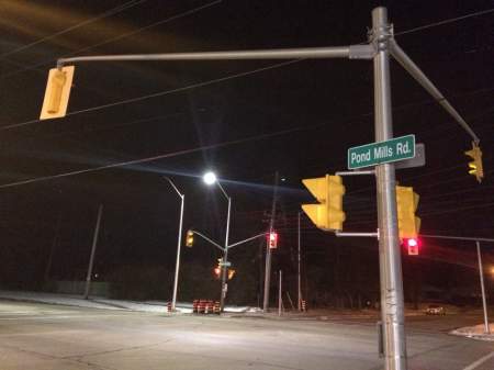 The closest intersection with a pedestrian crosswalk across Pond Mills Road is about 350 metres north, at the intersection of Deveron Crescent.