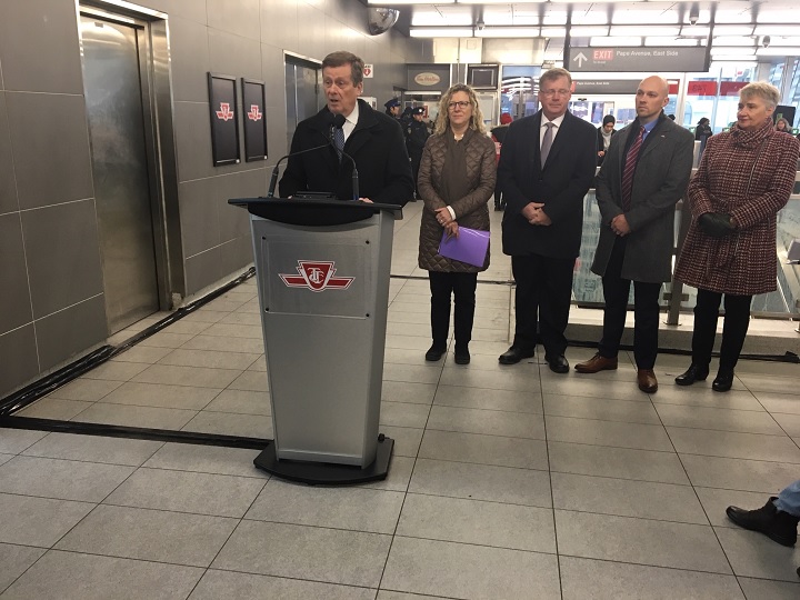 “I’m confident that Toronto residents want to move forward and they want transit built as soon as possible, including the relief line,” Tory said during a news conference at Pape Station.