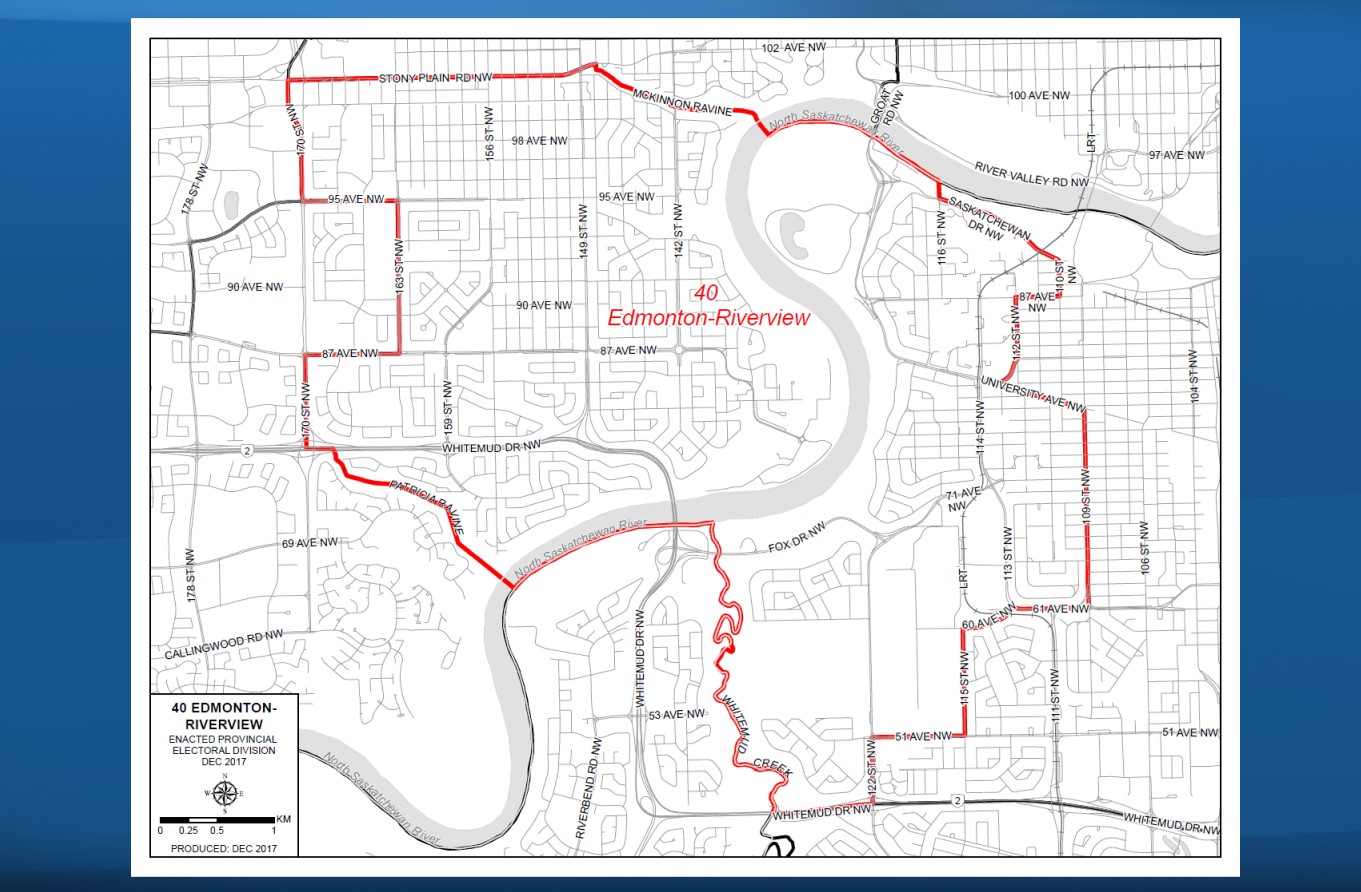 Below is a full list of the incumbent and candidates in the riding of Edmonton-Riverview, a riding in the south and west side of the city, encompassing the University of Alberta area south to Whitemud Drive, and west of the North Saskatchewan River to include some neighbourhoods in west Edmonton.