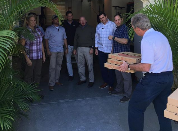 A photo posted on Bush’s Instagram and Facebook pages shows him delivering pizzas to the detail.