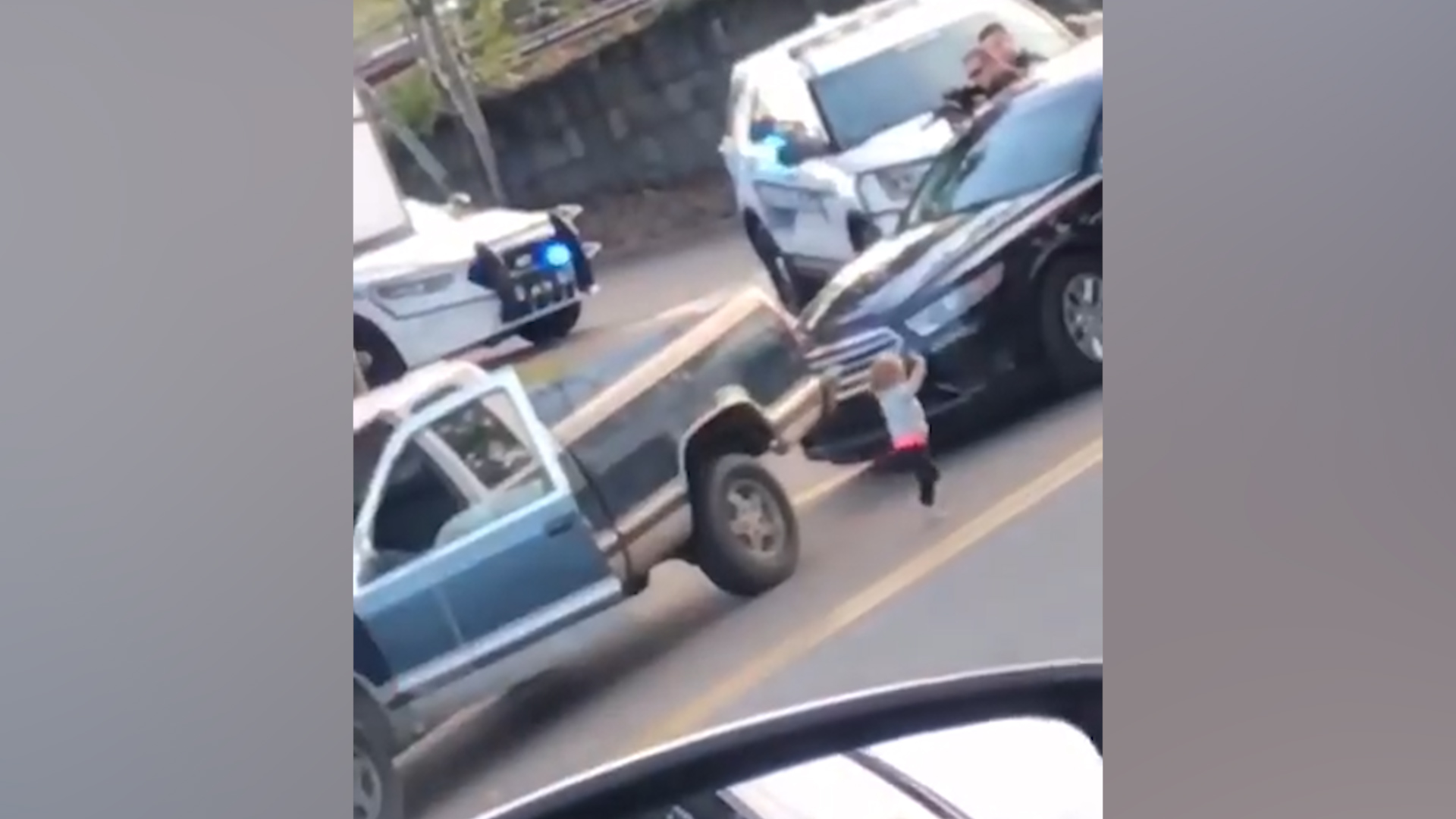 In the social media video, a man can be seen ordered out of the vehicle before a toddler can be seen slowly trying to exit. She eventually gets out of the truck and begins walking towards police with her hands raised, which police say was her “imitating” her parents.