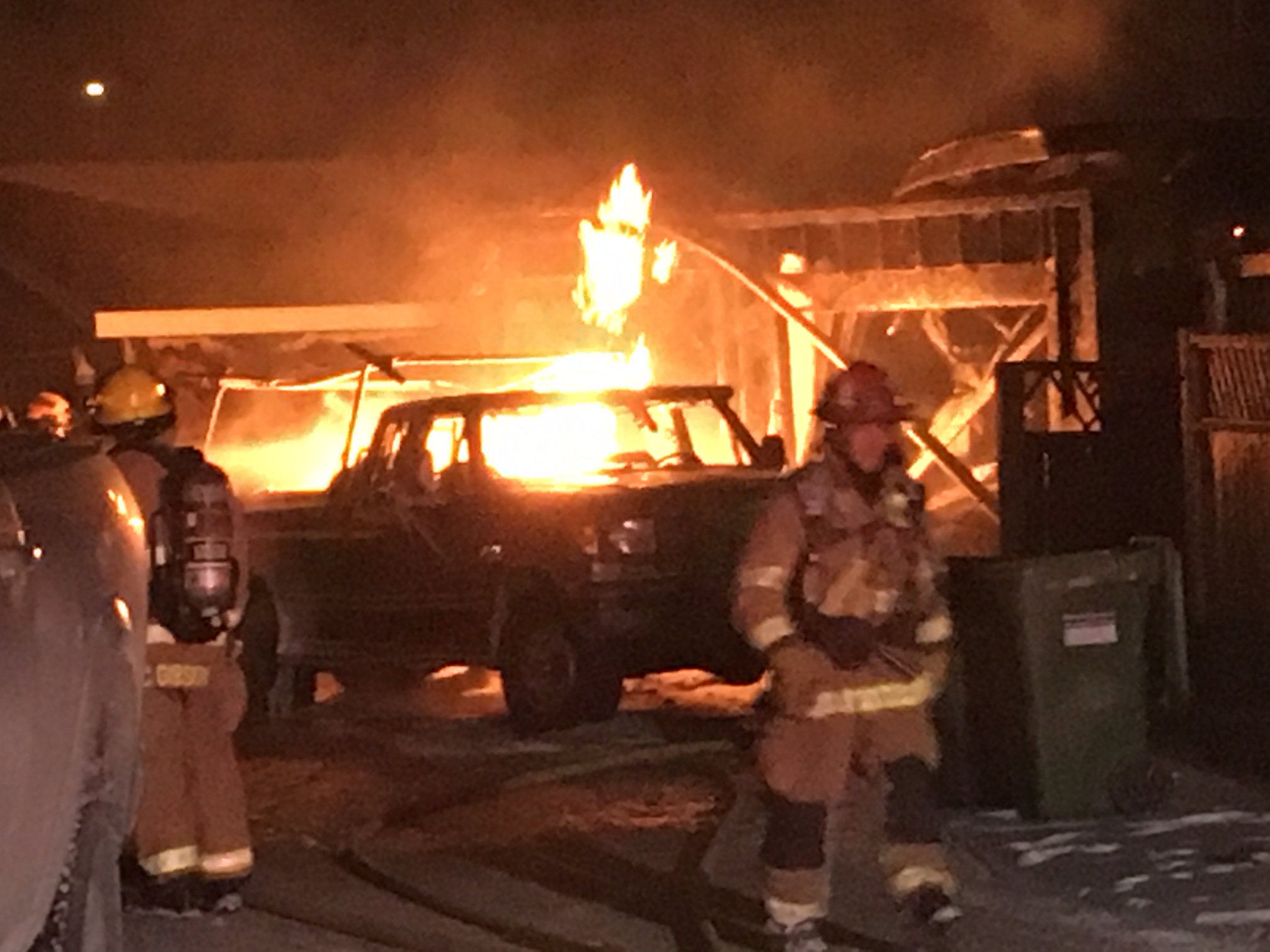 Several callers to 911 reported hearing a loud bang followed by flames coming from a pickup truck that was parked in an alleyway near a garage, fire said.