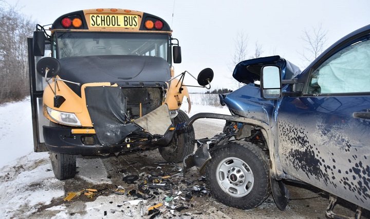 Blackfalds RCMP said a man driving a truck collided with a school bus on Township Road 372 and Range Road 281 at 8:12 a.m. on Tuesday.