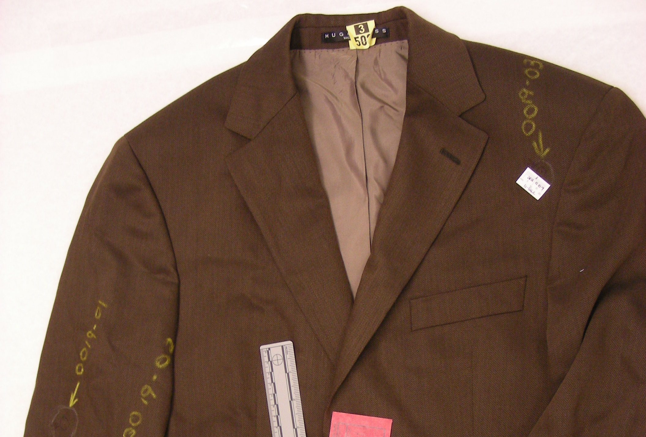 Images of the jacket depicted parts of the garment that were marked for testing. MacDonald chronicled at least three separate times that the jacket or parts of it were sent away for laboratory testing.